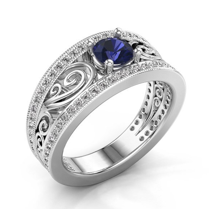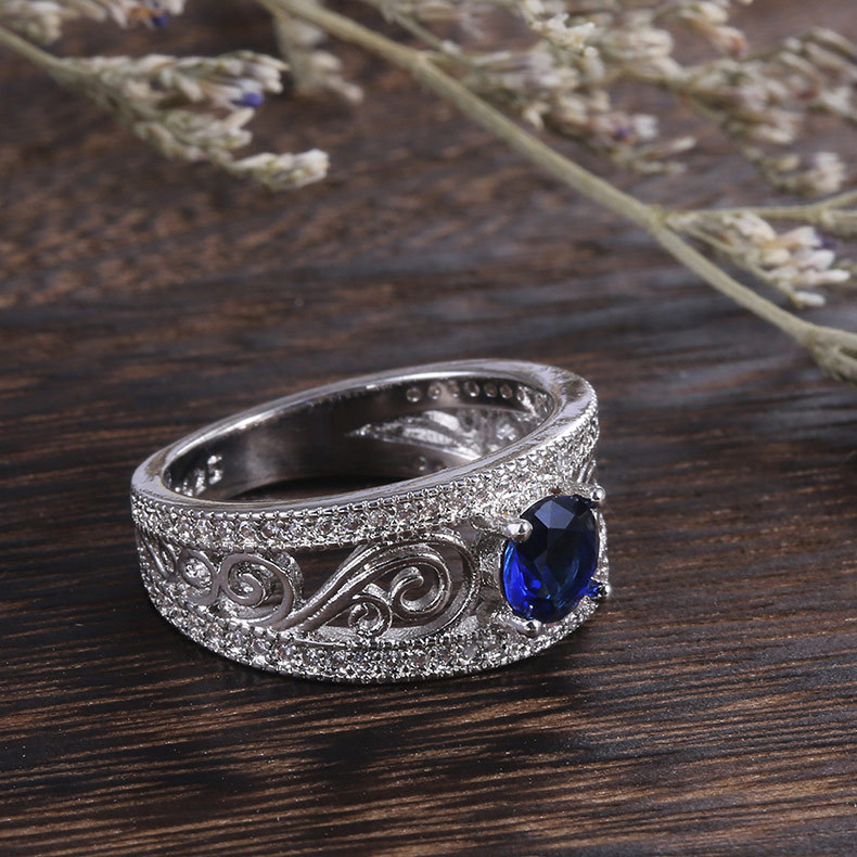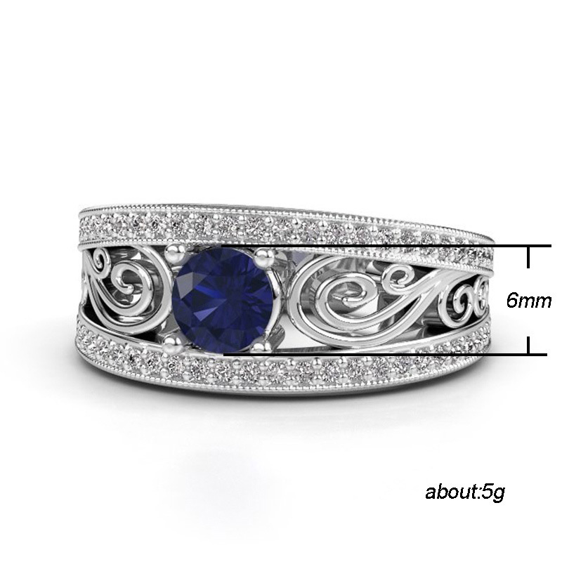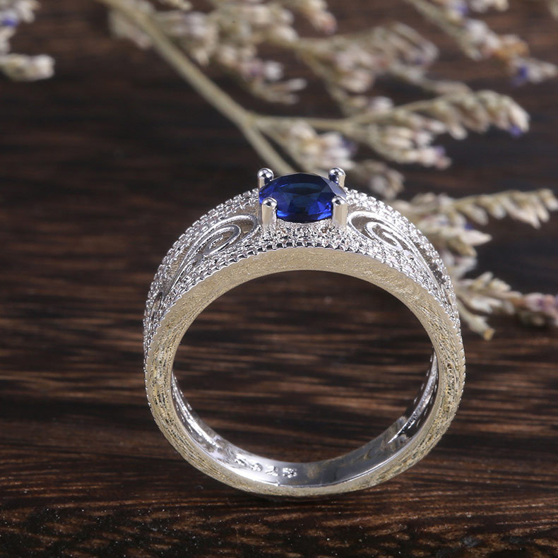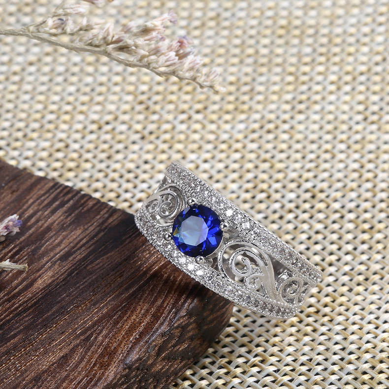 European and American new luxury hollow flower inlaid blue zircon ring female fashion party ring