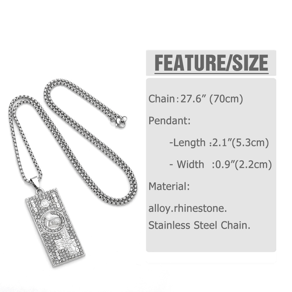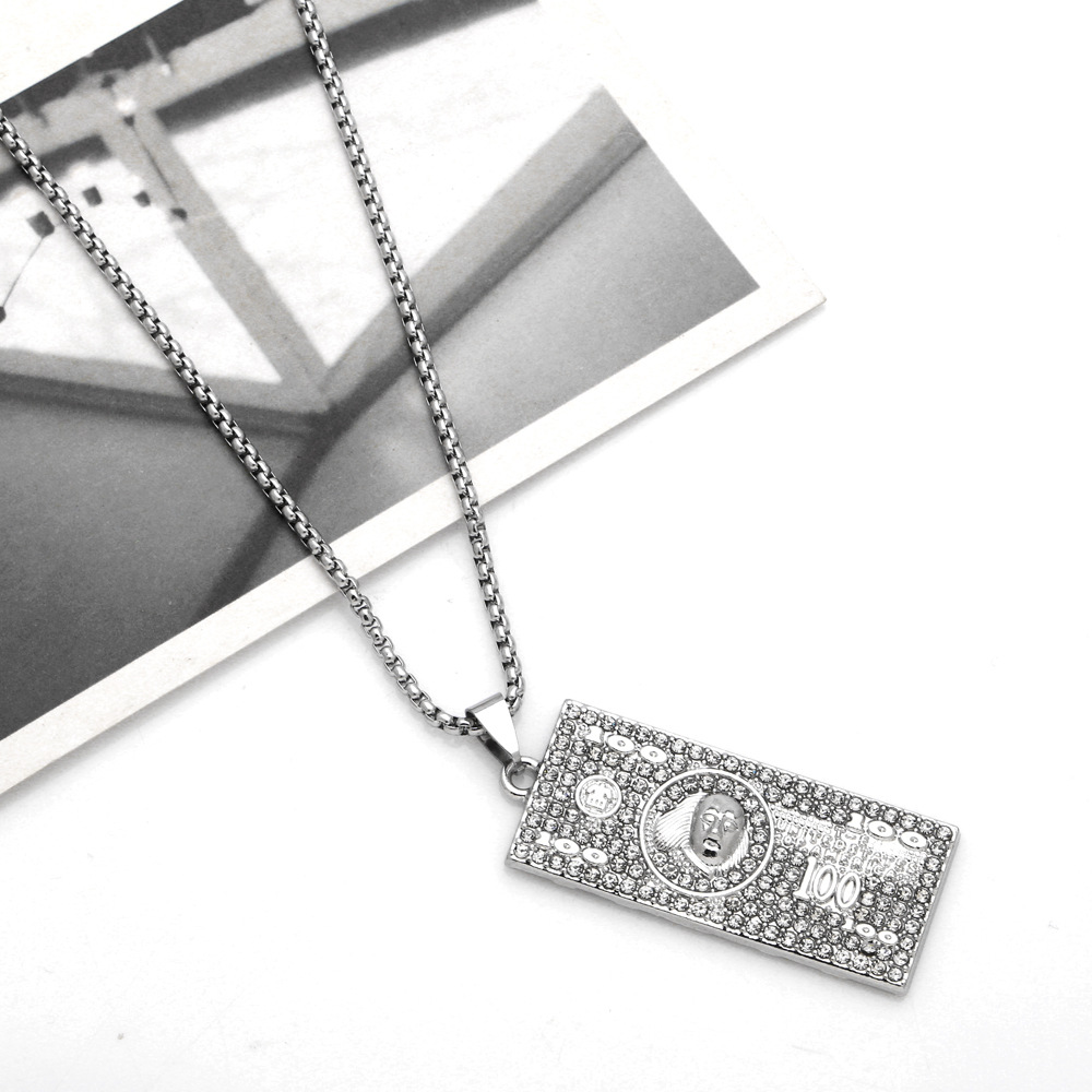 European and American personality hip-hop dollar bill necklace men and women trendy square pendant alloy rhinestone long necklace nkt34