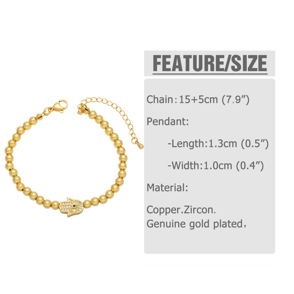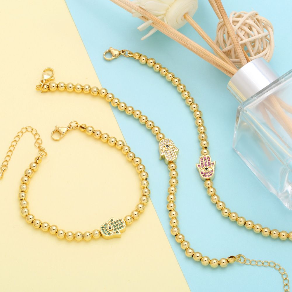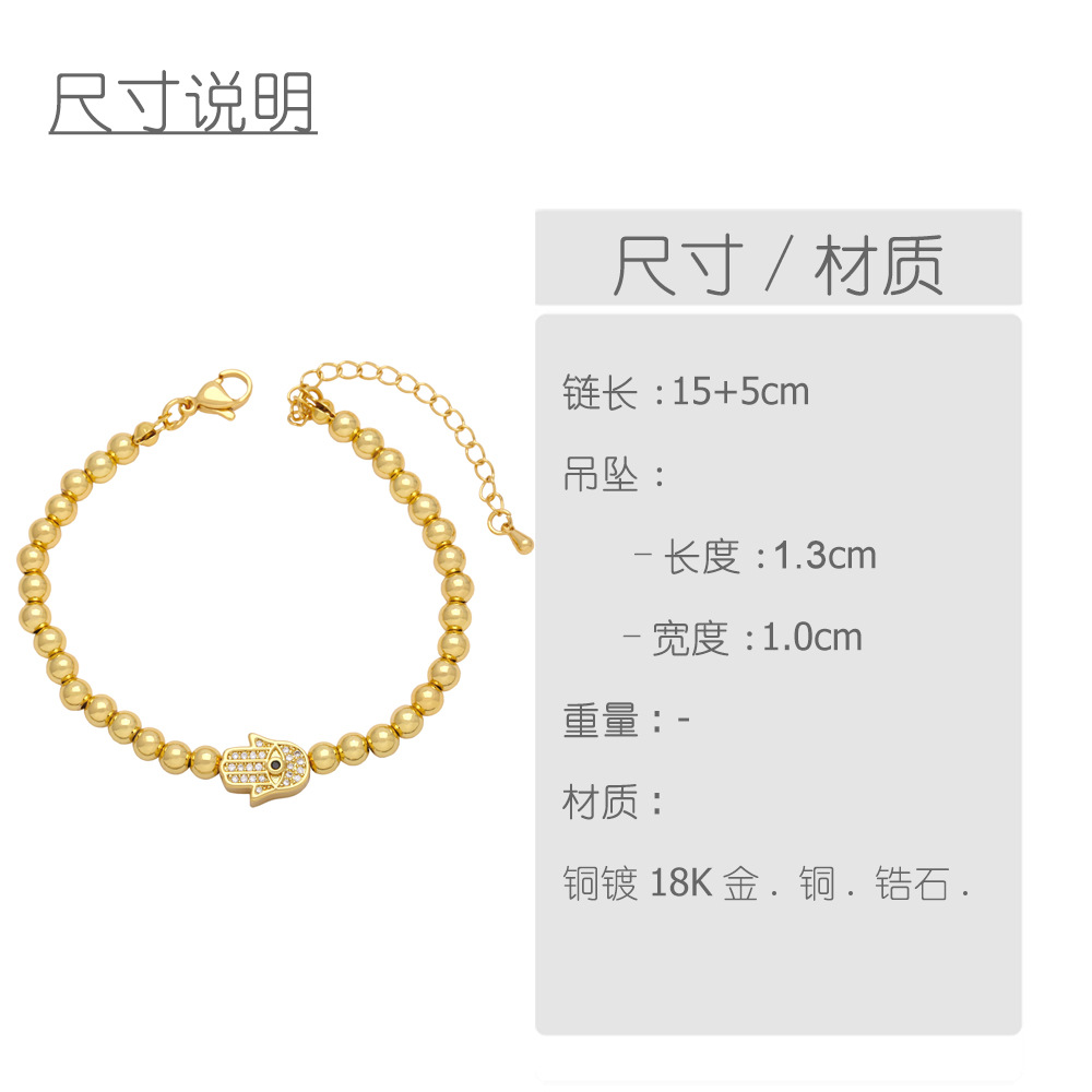 European and American personality hip-hop inlaid zircon Fatima hand bracelet female copper plated 18K gold round bead bracelet brc01