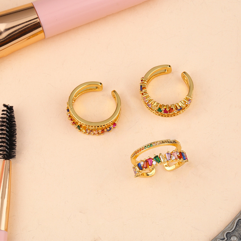 European and American popular rainbow jewelry double-layer open ring copper plated real gold zircon ring joint ring rih92
