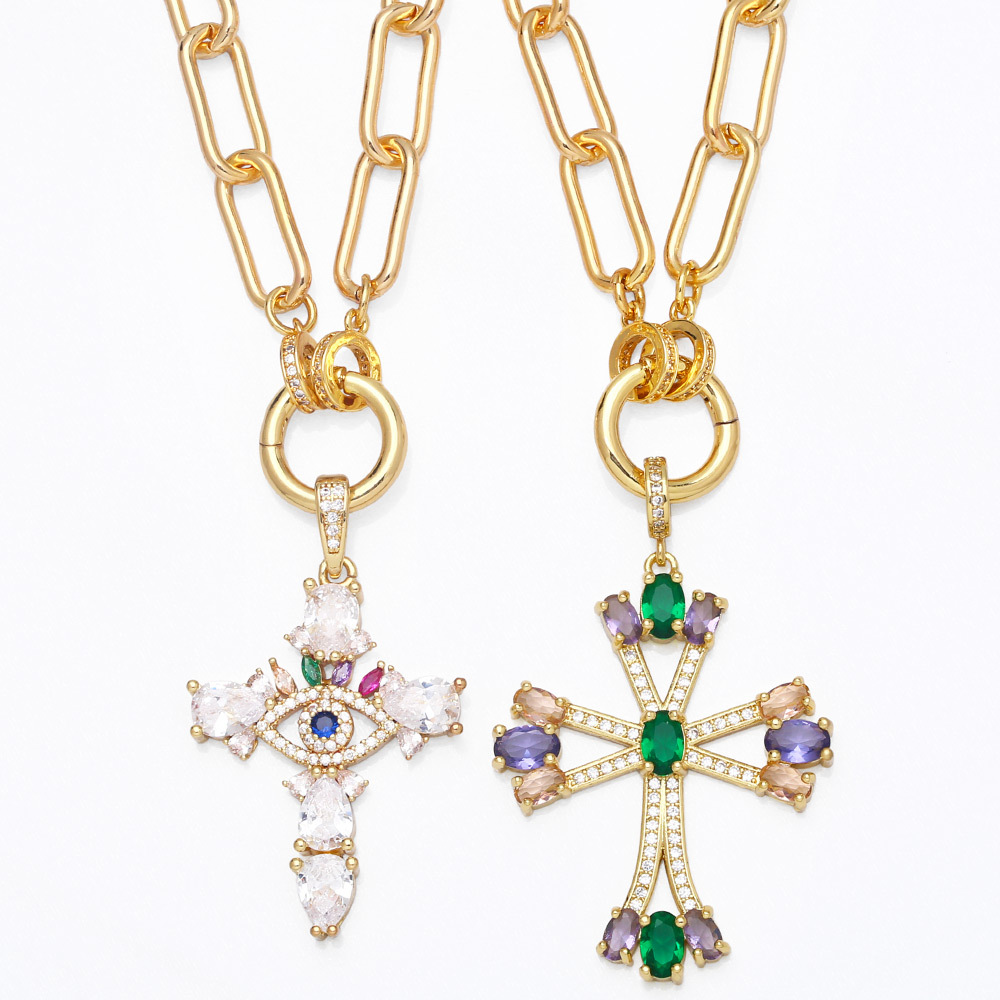 Collier avec pendentif croix hip-hop tendance européen et américain pour femme, chaîne de pull polyvalente en zircone micro-incrustée de pierres précieuses colorées, nkb072