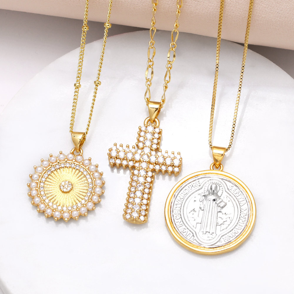 Collier avec pendentif croix Notre-Dame plaqué or et zircons incrustés, chaîne de clavicule, nka076