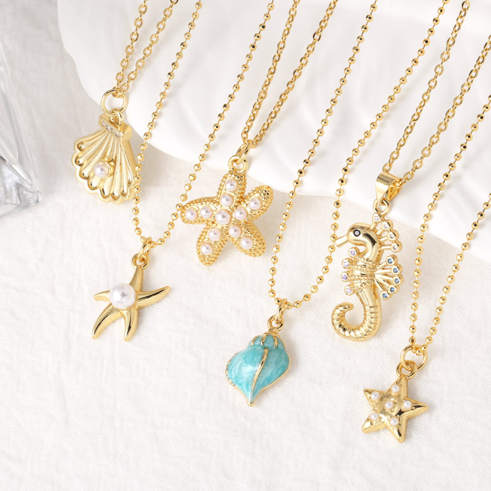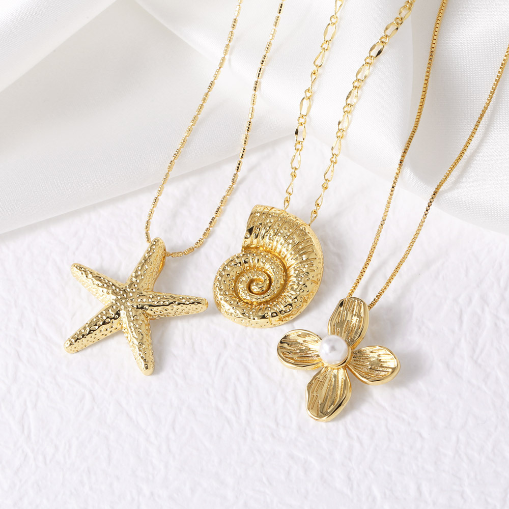 Collier en or 18 carats plaqué cuivre, style océan, perle, conque, étoile de mer, collier clavicule, pour femme, nkb593