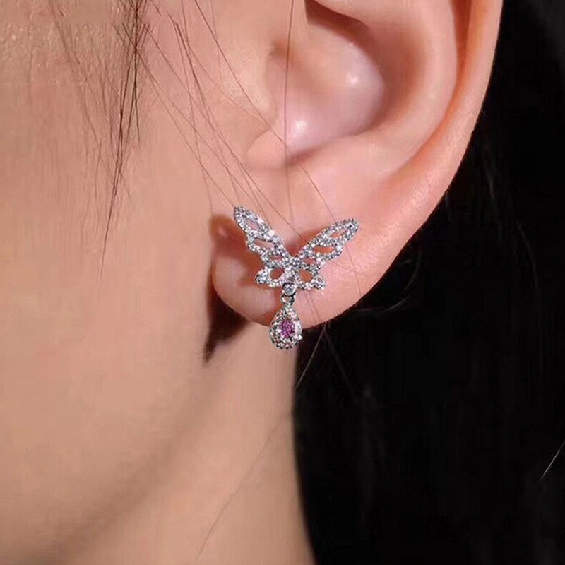 Boucles d'oreilles design de niche, boucles d'oreilles papillon en diamant rose esthétique super féerique pour femmes, boucles d'oreilles de mariage luxueuses incrustées de zircons