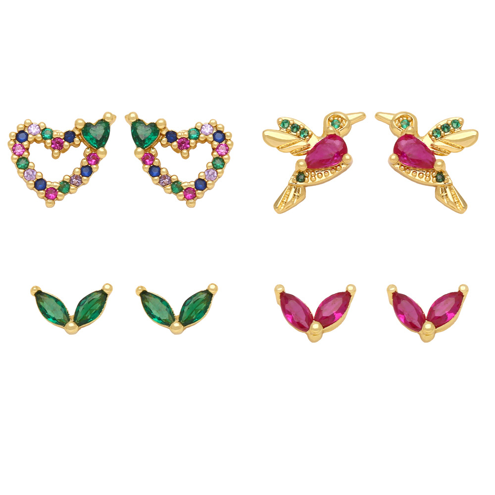 Boucles d'oreilles en forme de cœur en zircon coloré européen et américain, design de mode de célébrité Internet, boucles d'oreilles en forme de feuille d'oiseau err42