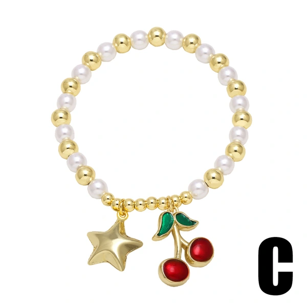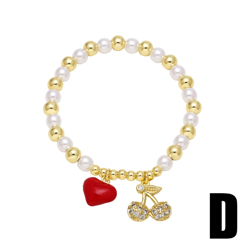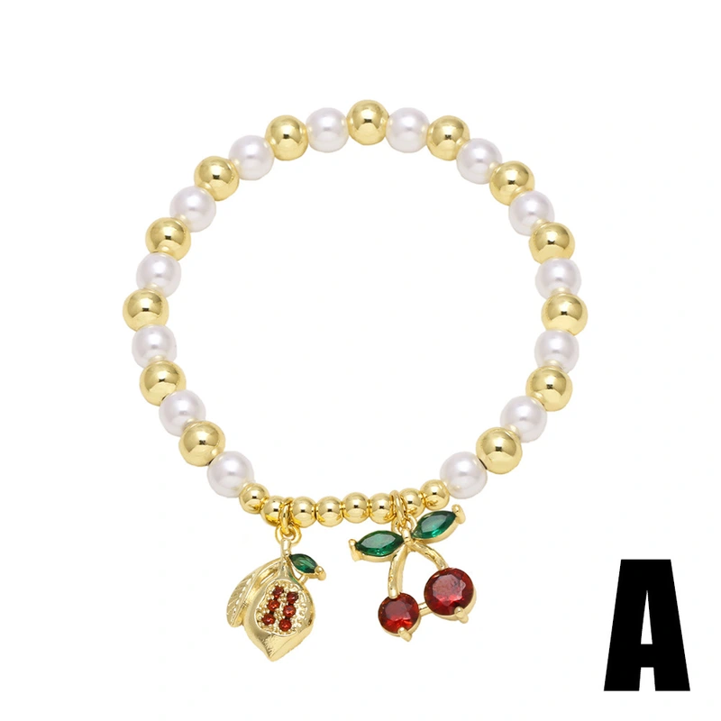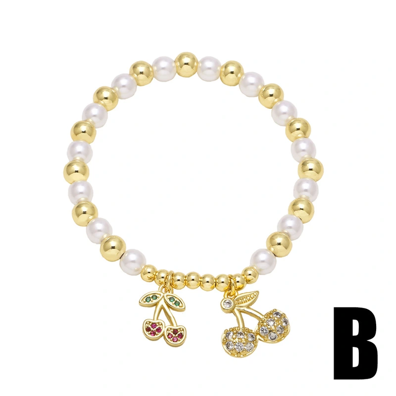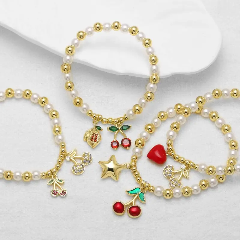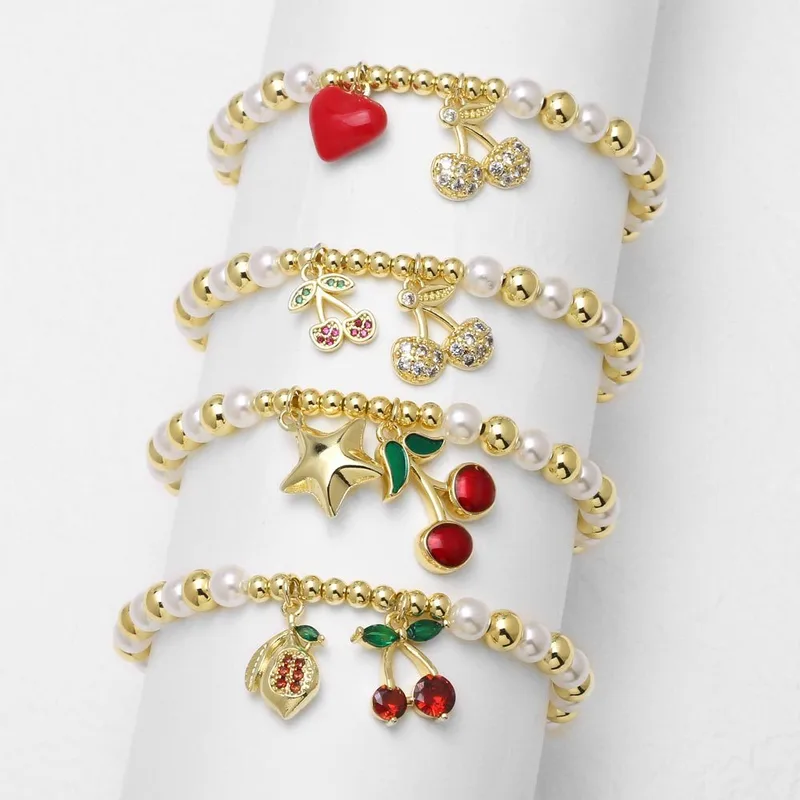 Bracelet en perles et zircons plaqués cuivre véritable or, pendentif cerise, bijou féminin, brm93