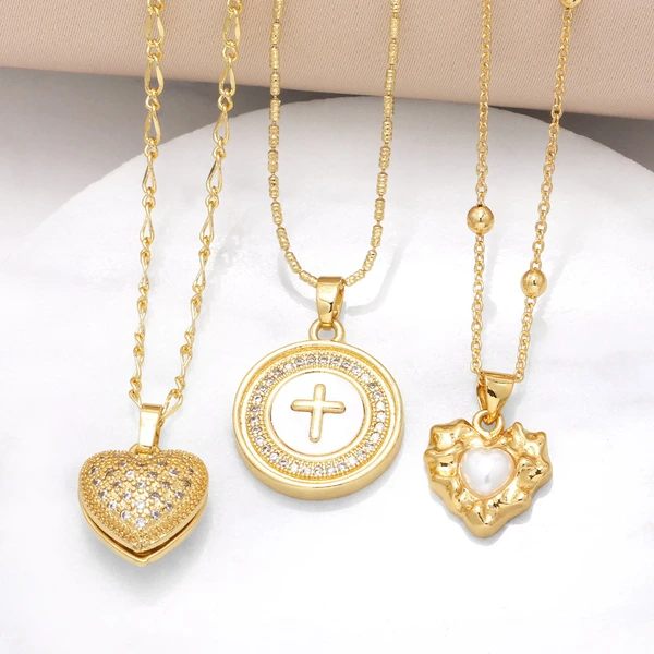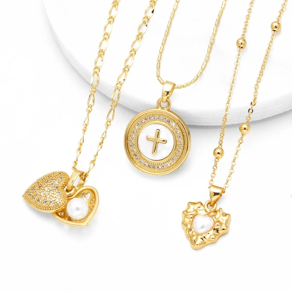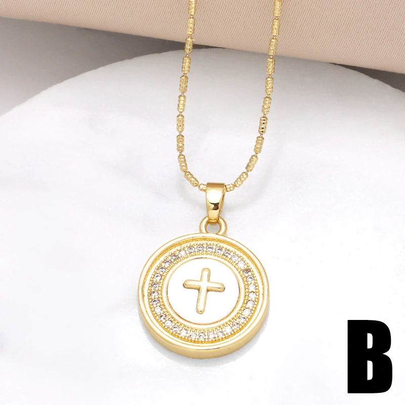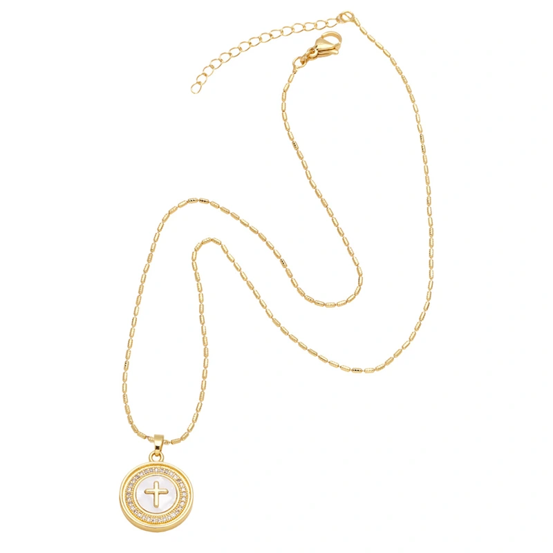 Collier avec pendentif croix en forme de coquillage plaqué or et zircons nkb361
