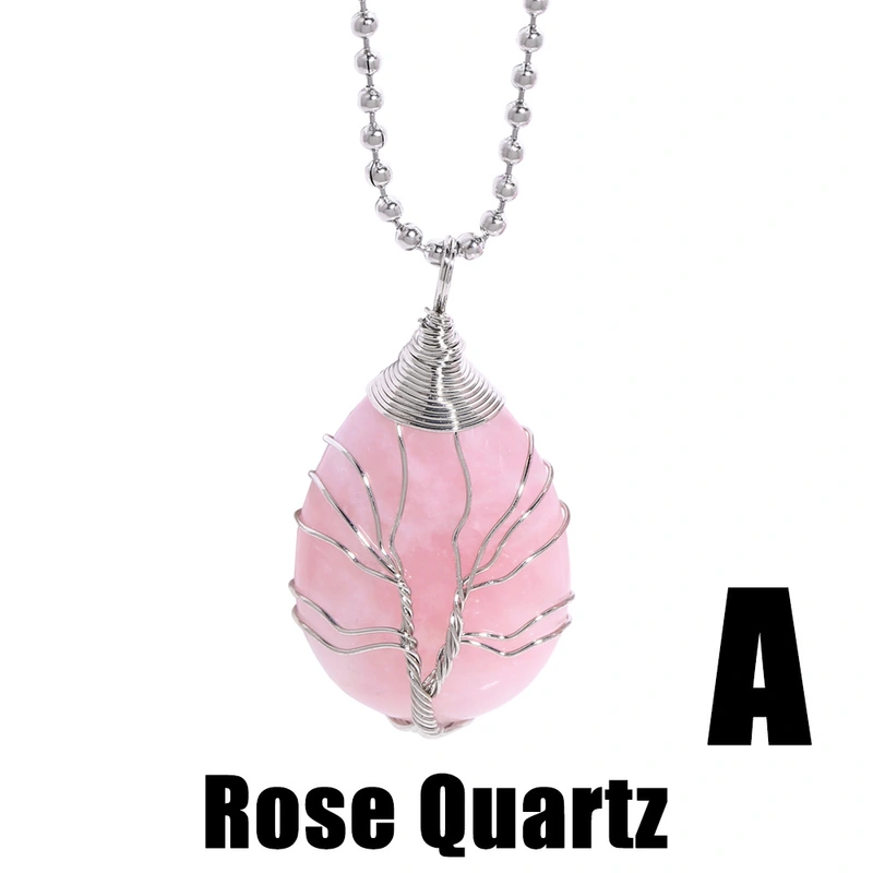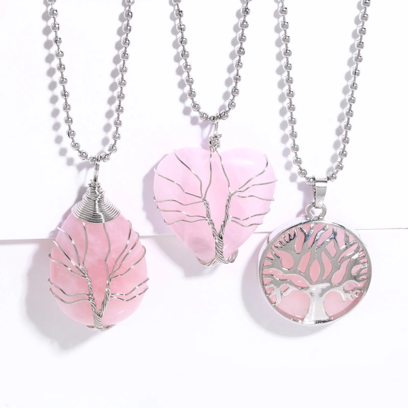 Collier pendentif arbre de vie en cristal rose, goutte d'eau, amour, enroulé, fait main, en cristal, nkb668