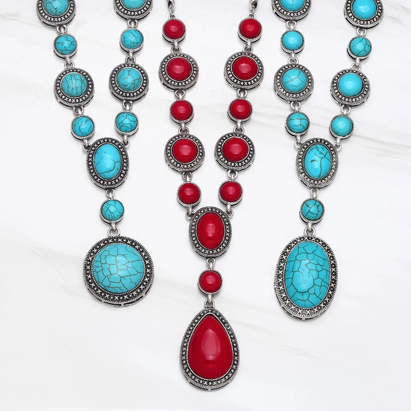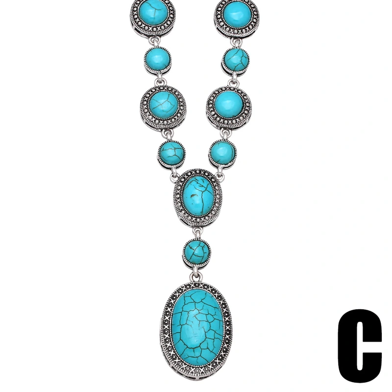Collier turquoise européen et américain, collier rétro rond en alliage de forme géométrique, vente en gros nka098