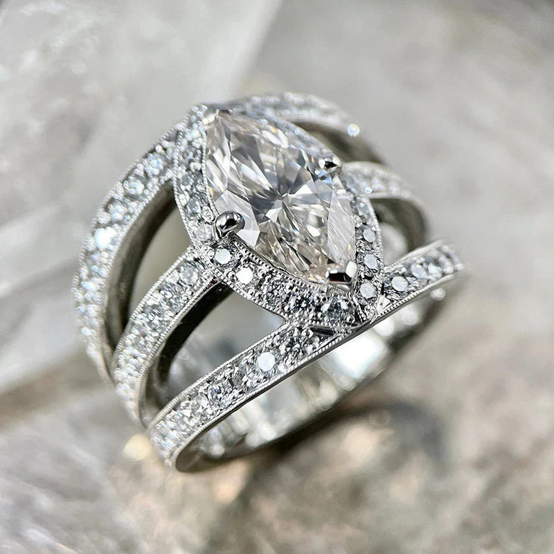 Bague de luxe européenne et américaine, bague en zircon œil de cheval à la mode, bague d'index à design creux multicouche