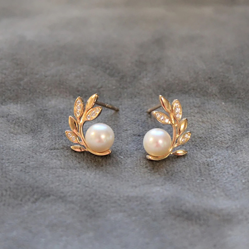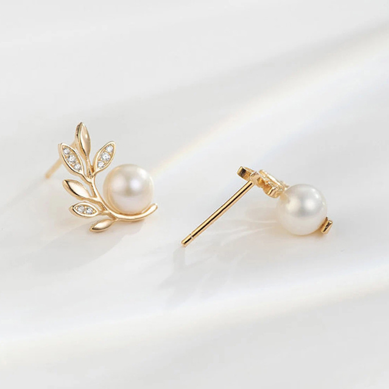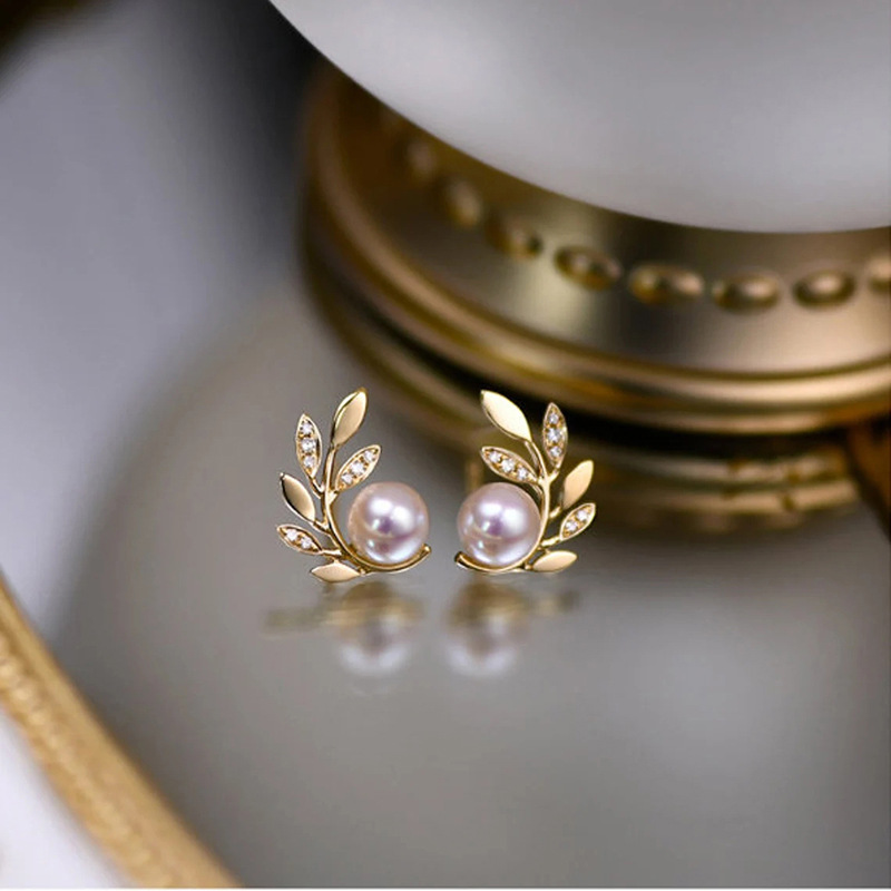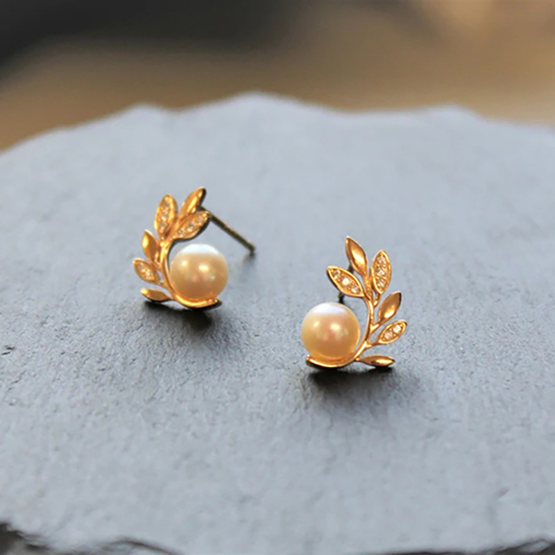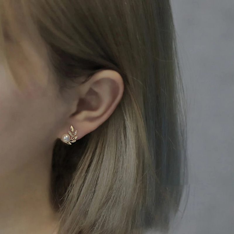 French high-end design mirror earrings branches and leaves imitation pearl earrings fashionable Korean version earrings for women