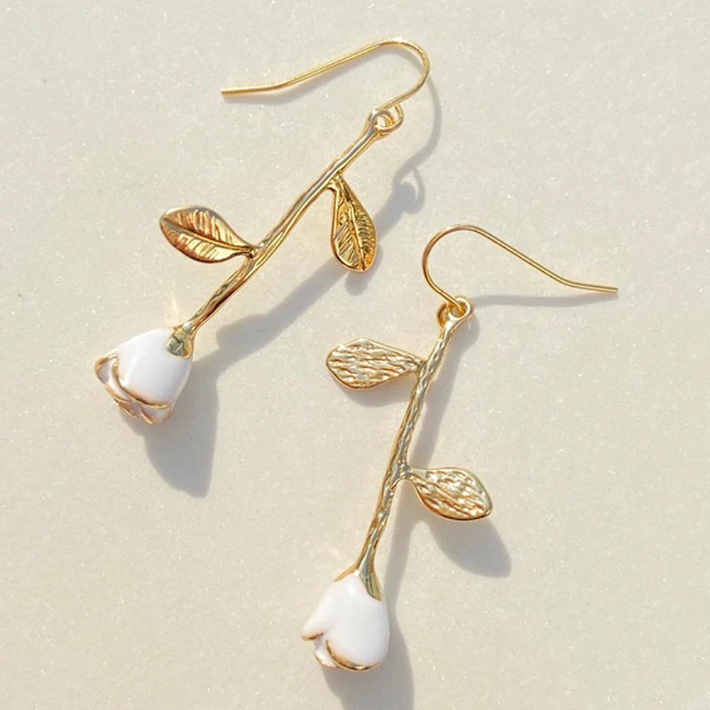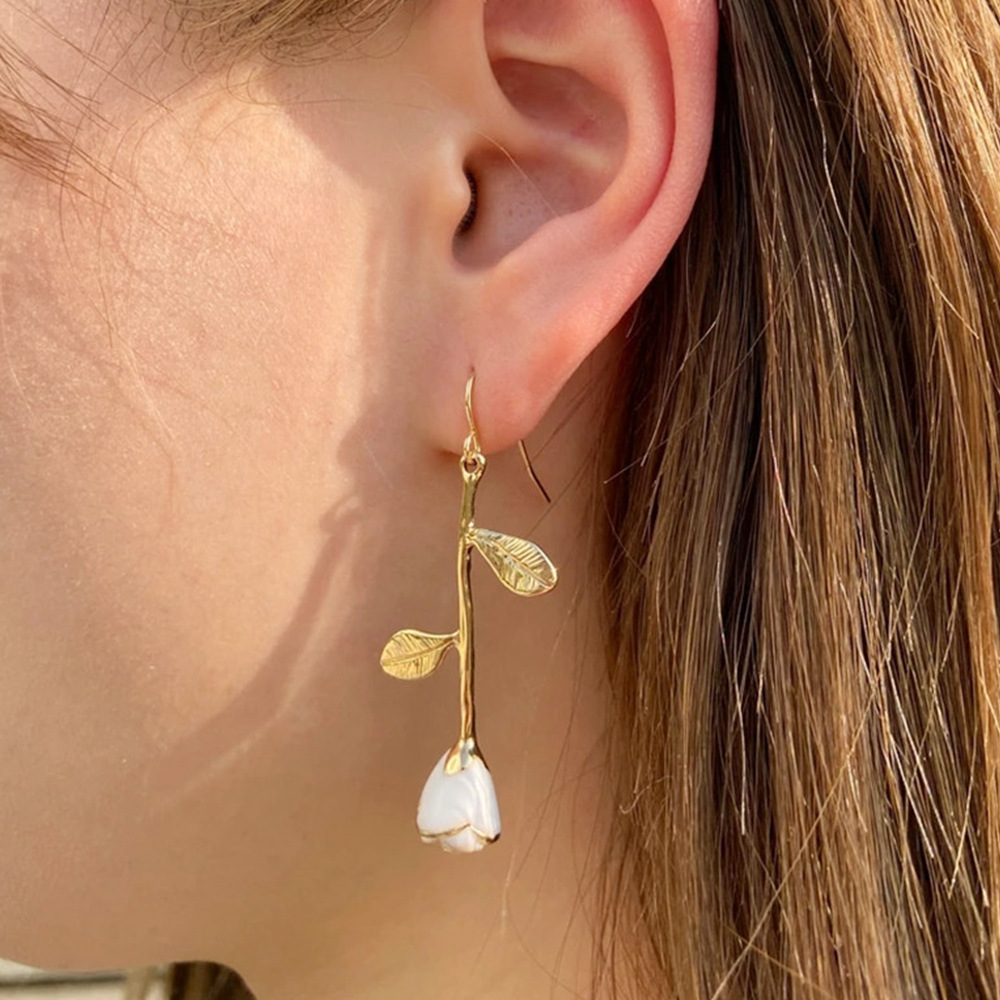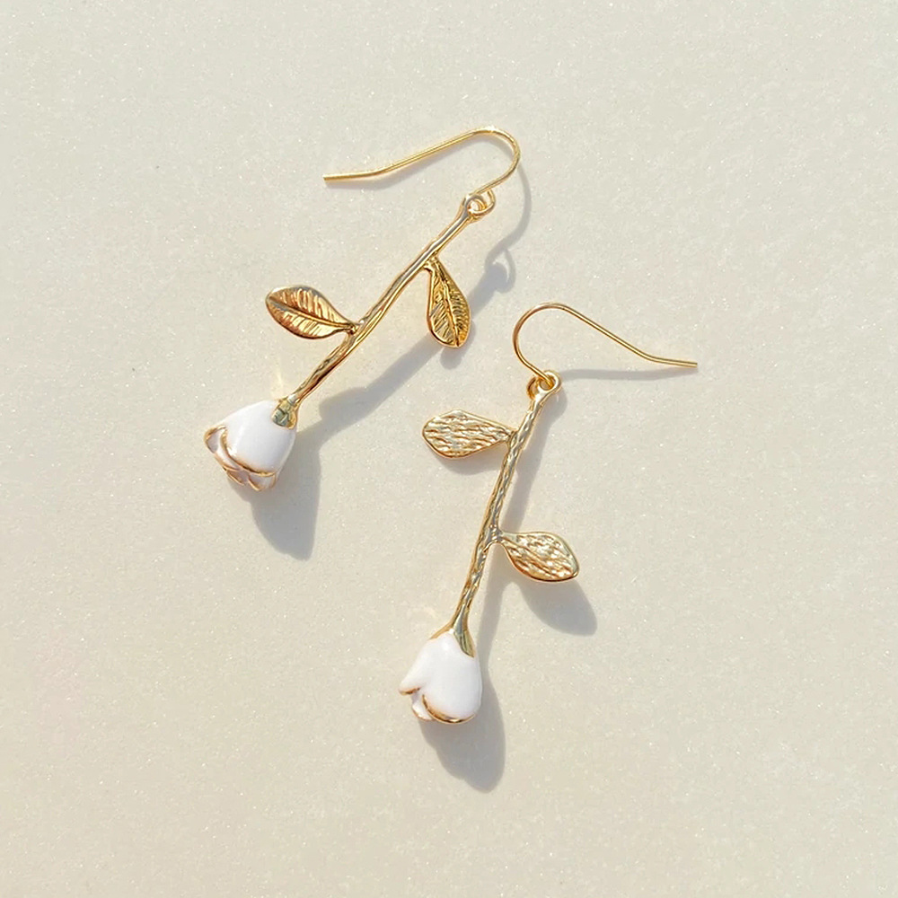 French romantic and gentle style rose branch earrings "White Rose" temperament versatile long earrings