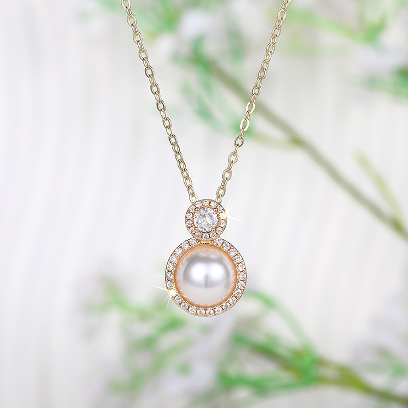 Glossy French temperament necklace with round geometric imitation pearl pendant and micro-inlaid zircon stacking style