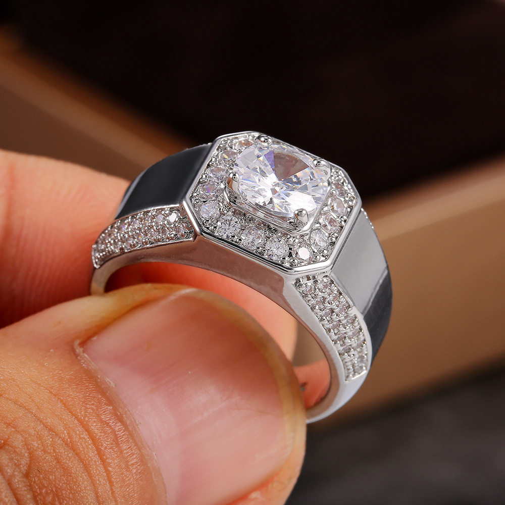Hot sale of luxury exquisite men's rings, European and American silver plated with 18K white gold simulated zircon jewelry