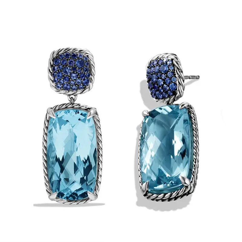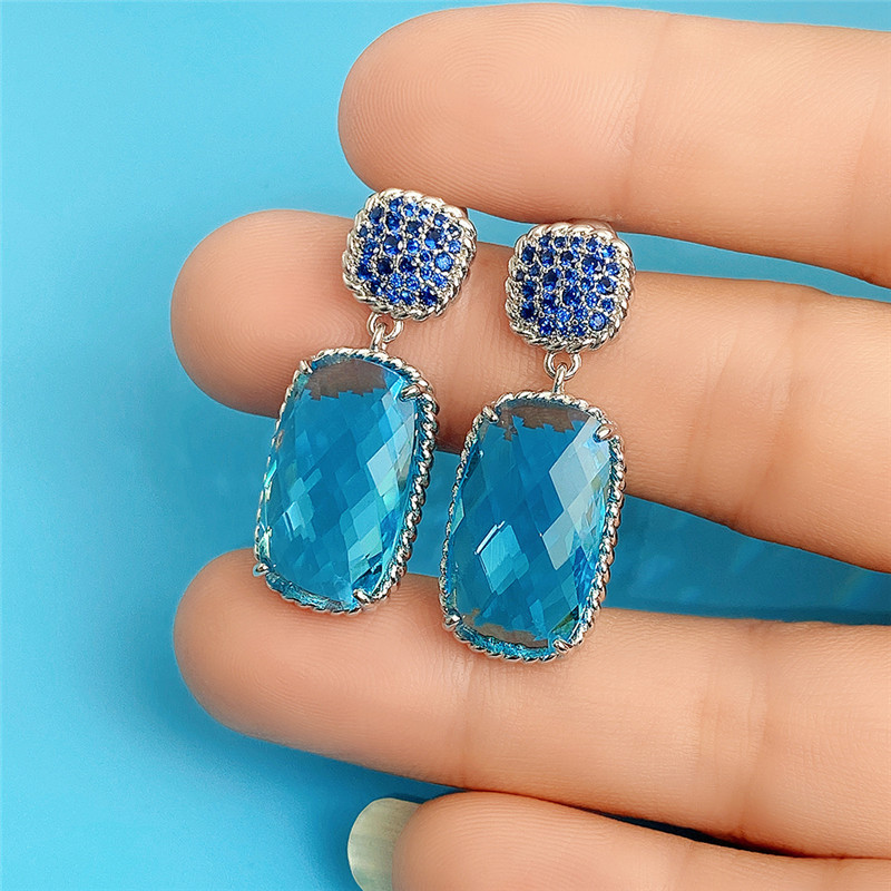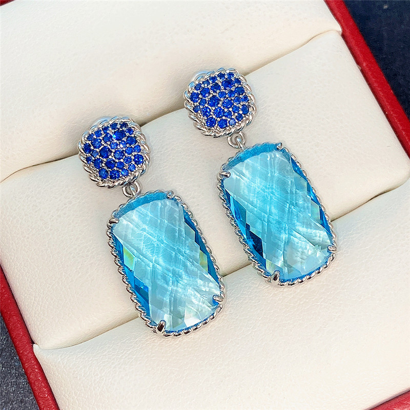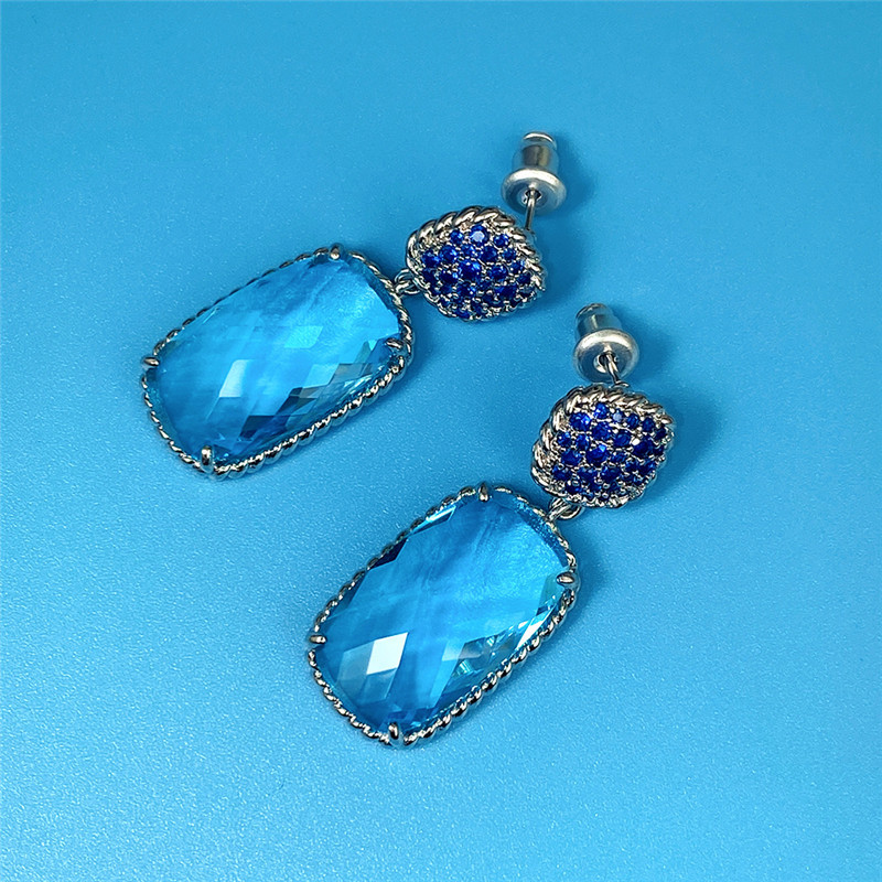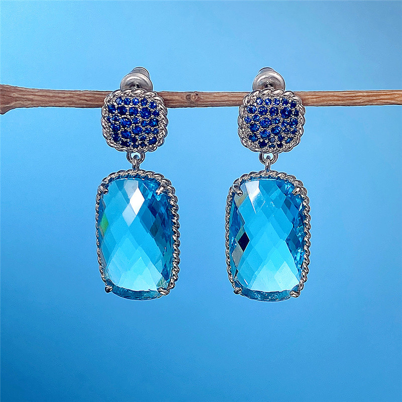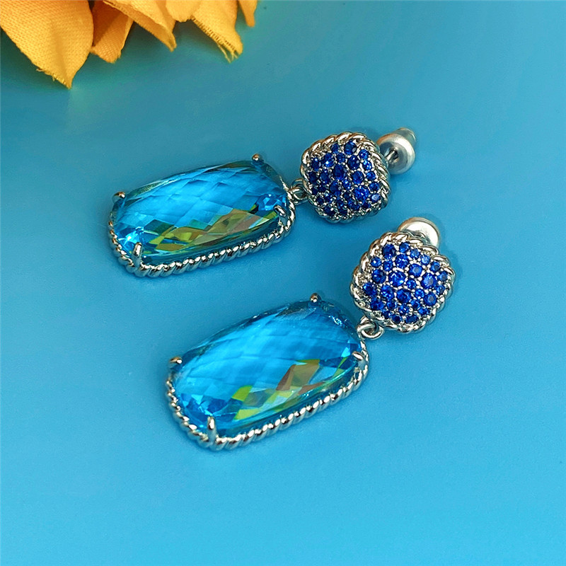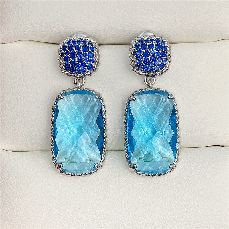 Hot selling long simulated aquamarine earrings, luxurious oversized fat square diamond zircon earrings for women