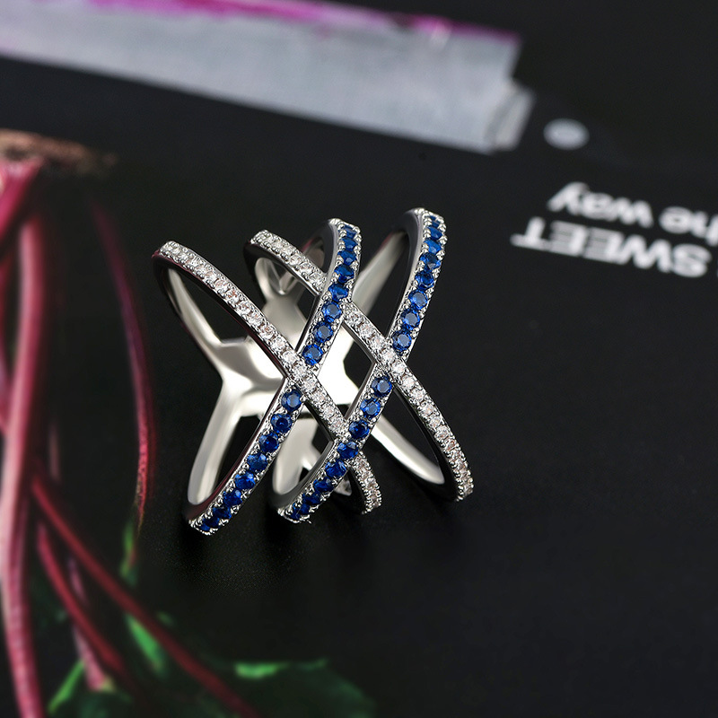 Hot selling new creative cross X-shaped full inlaid blue diamond zircon ring fashionable women's party ring