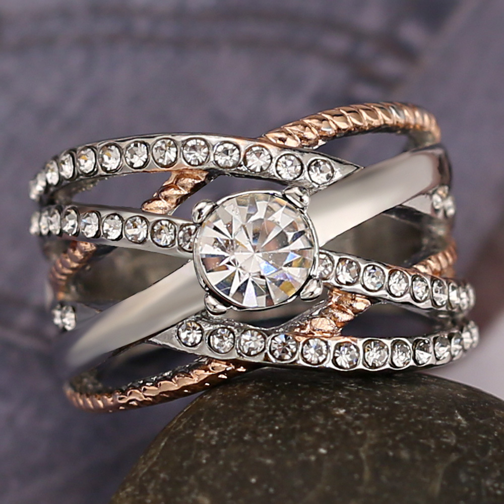 Hot selling new creative geometric lines interwoven rose gold plated two-tone ring for women