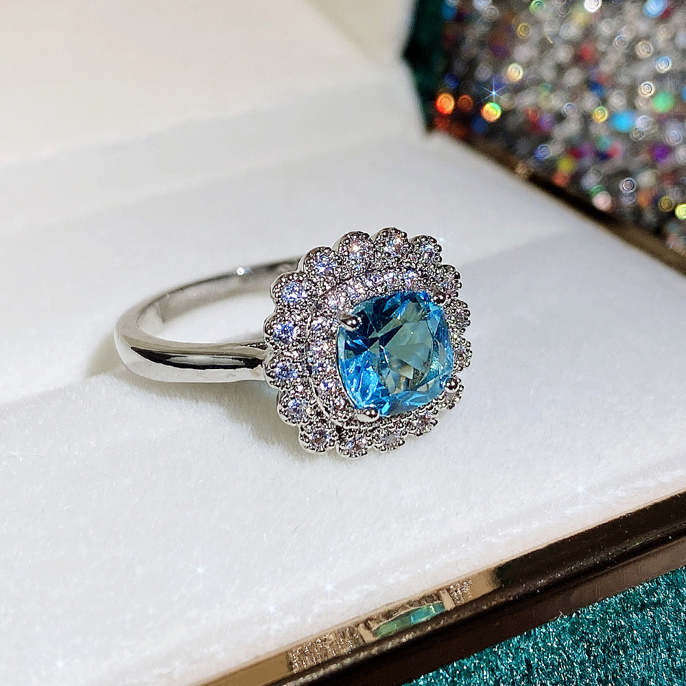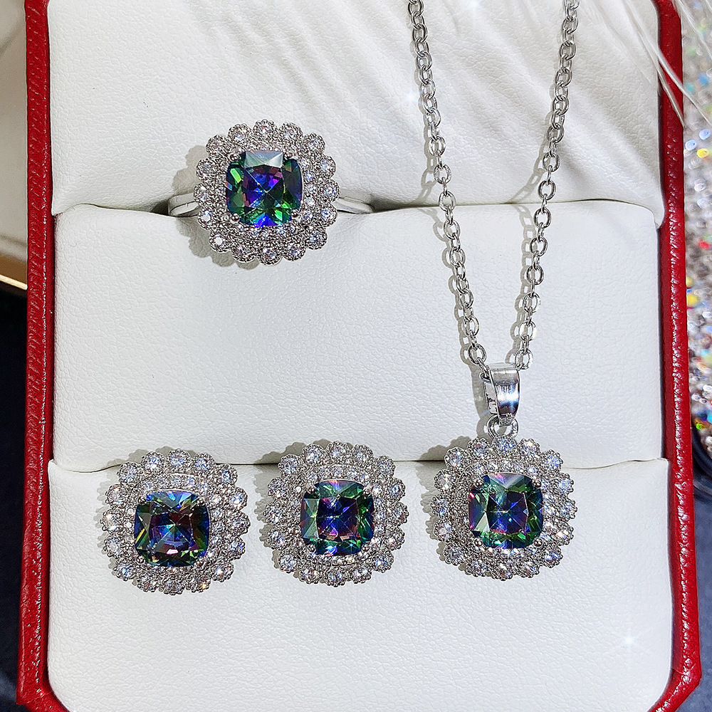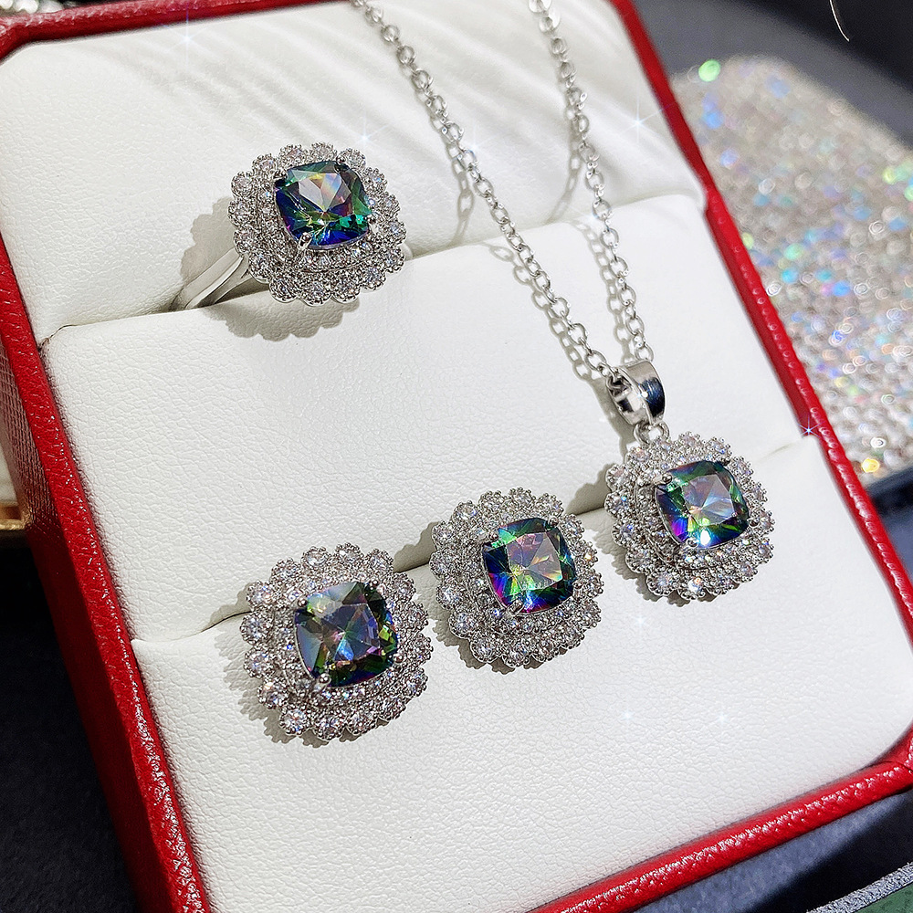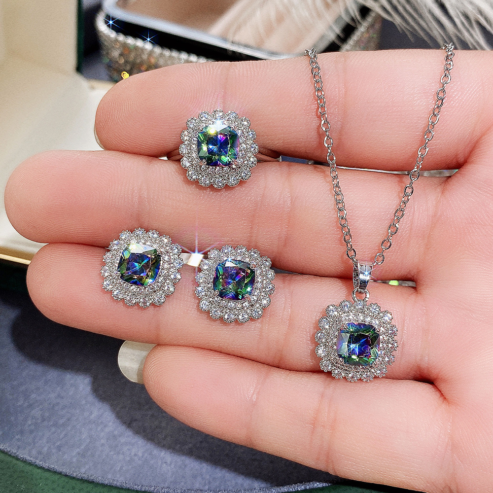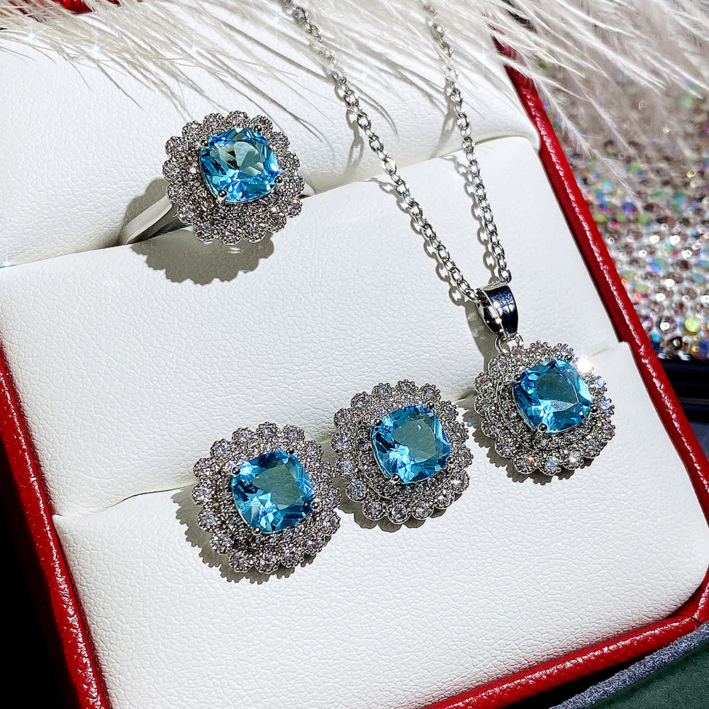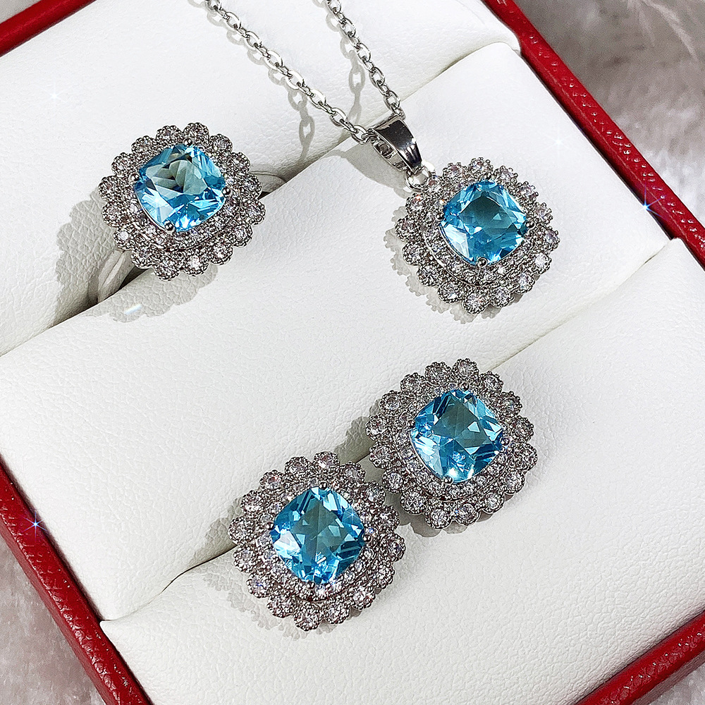 Internet celebrity live jewelry set luxury colored zircon necklace sea blue earrings and ring set