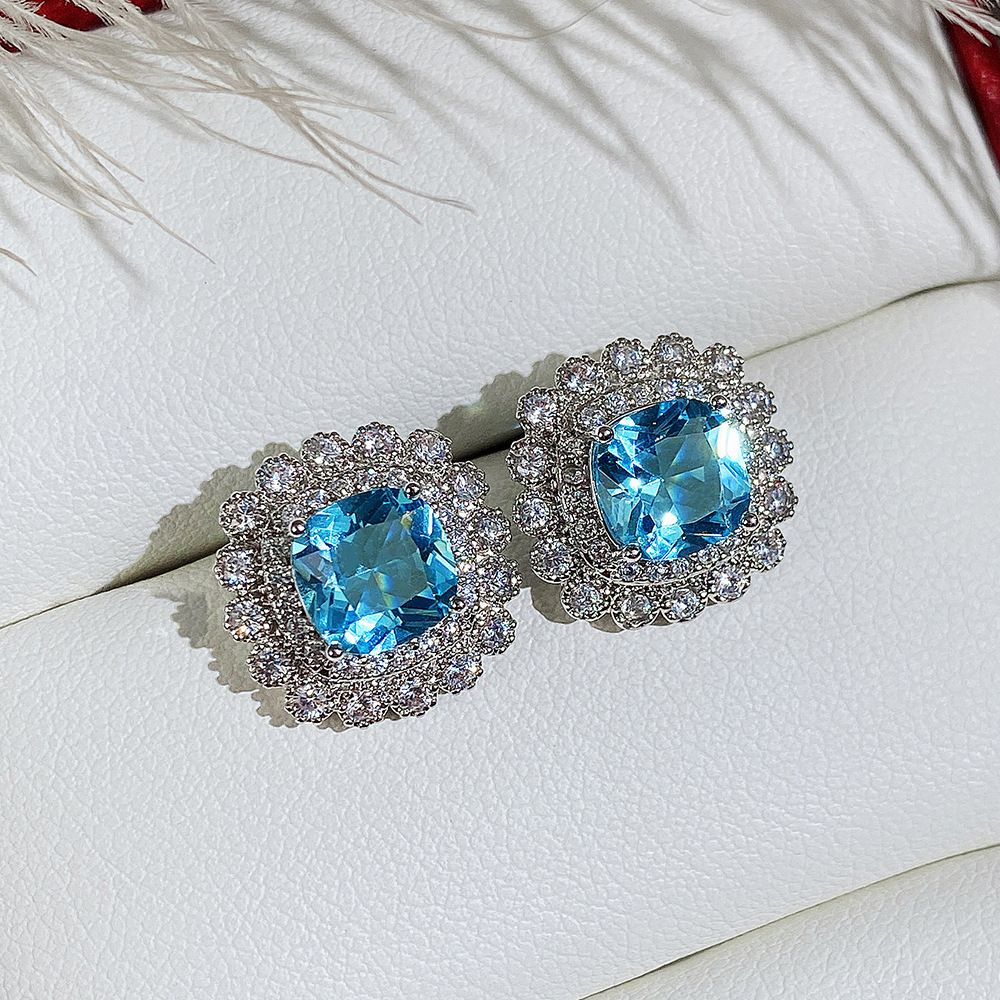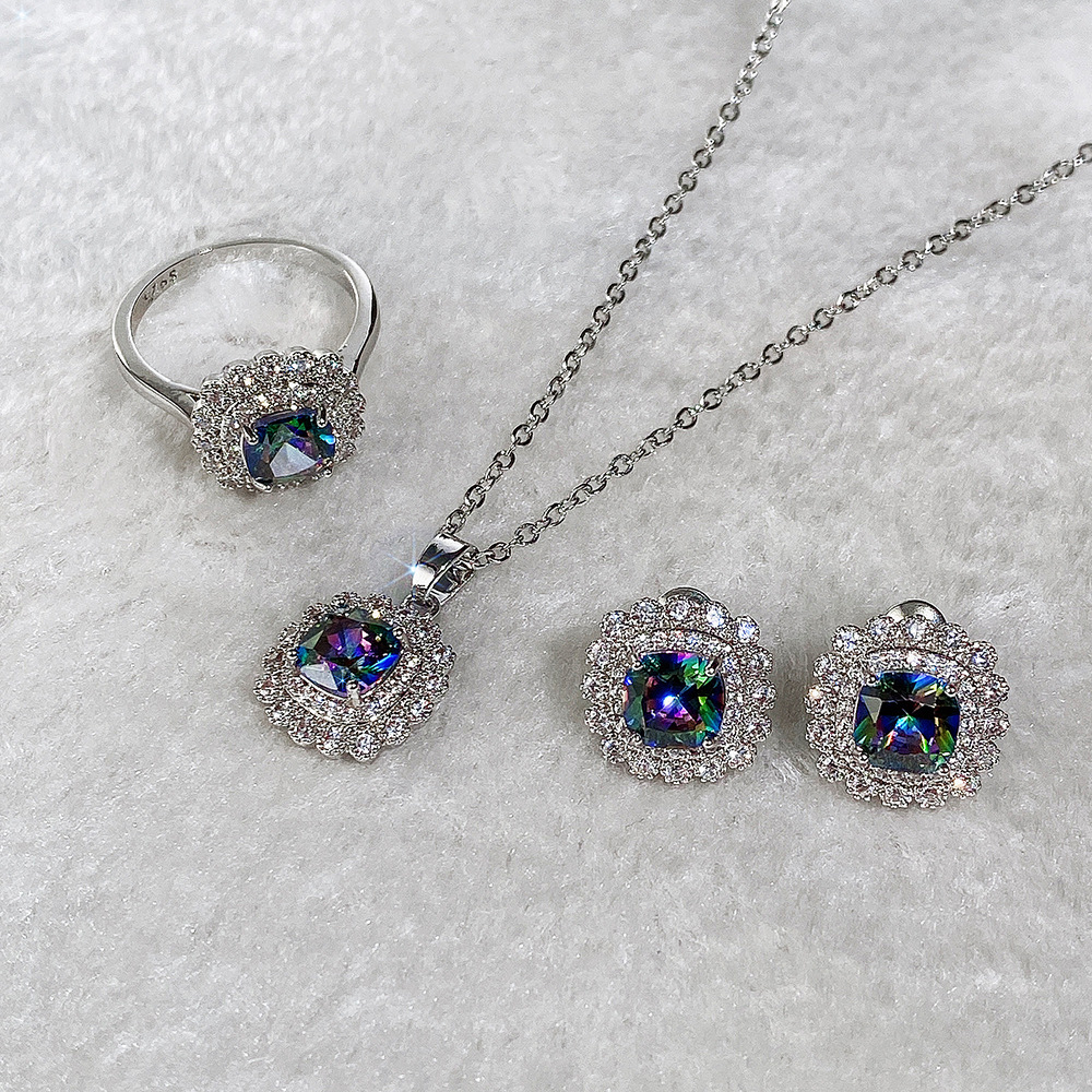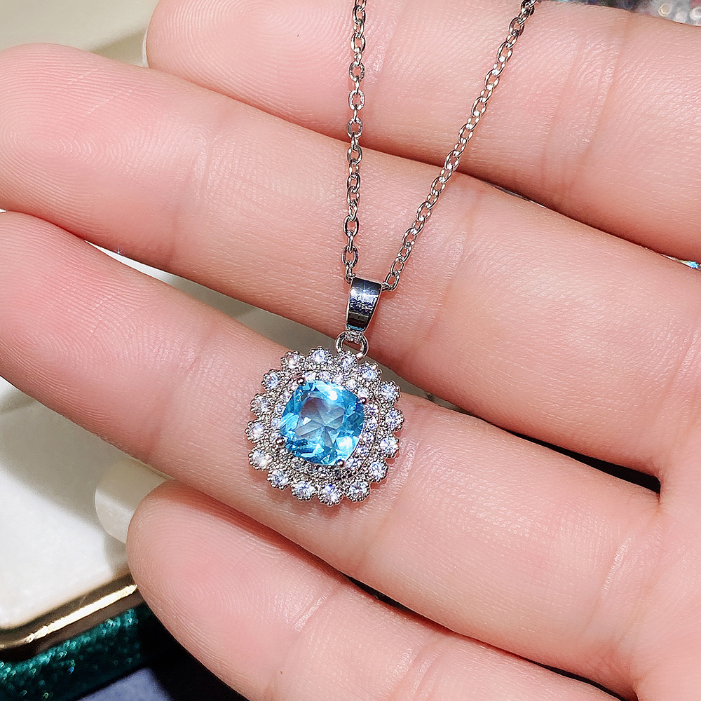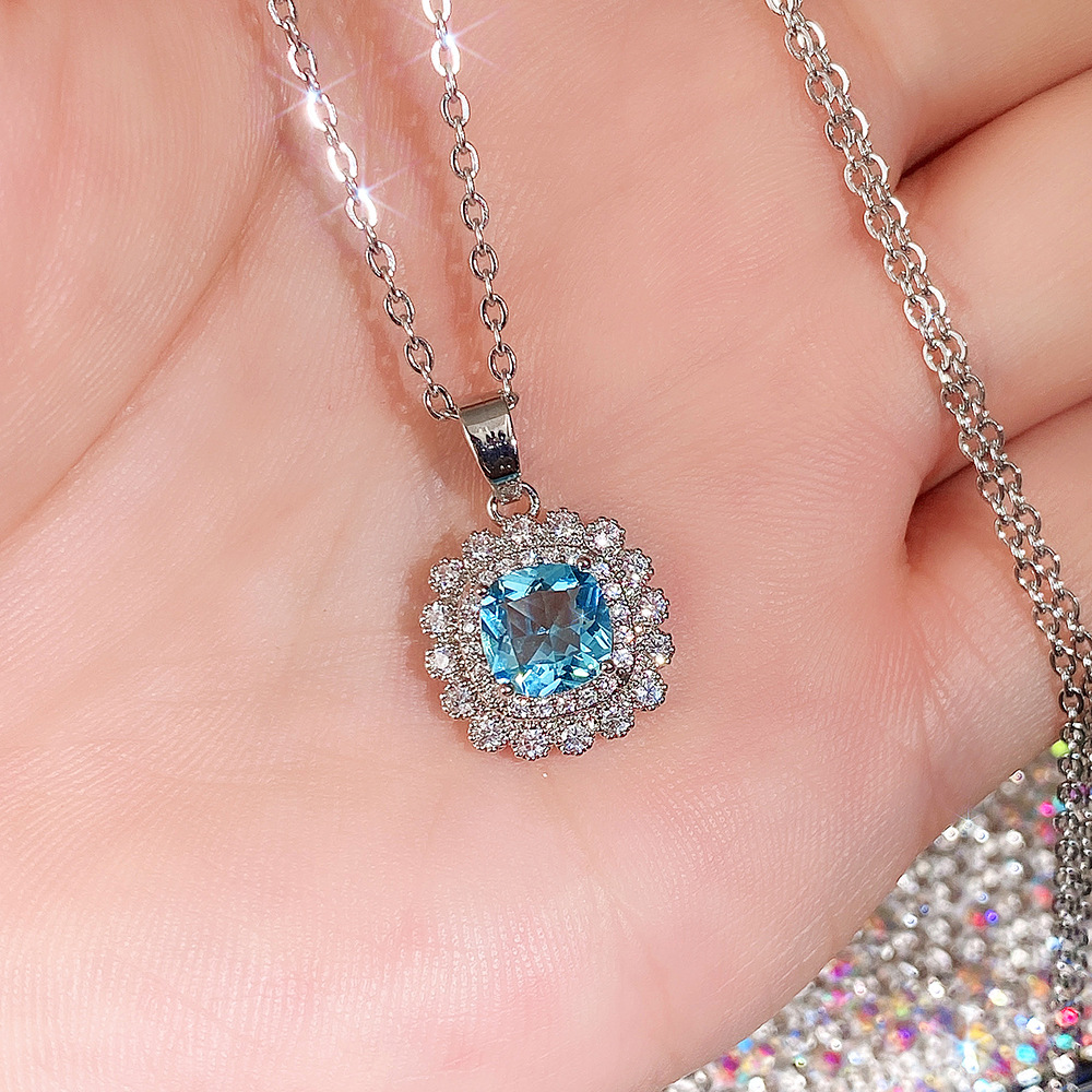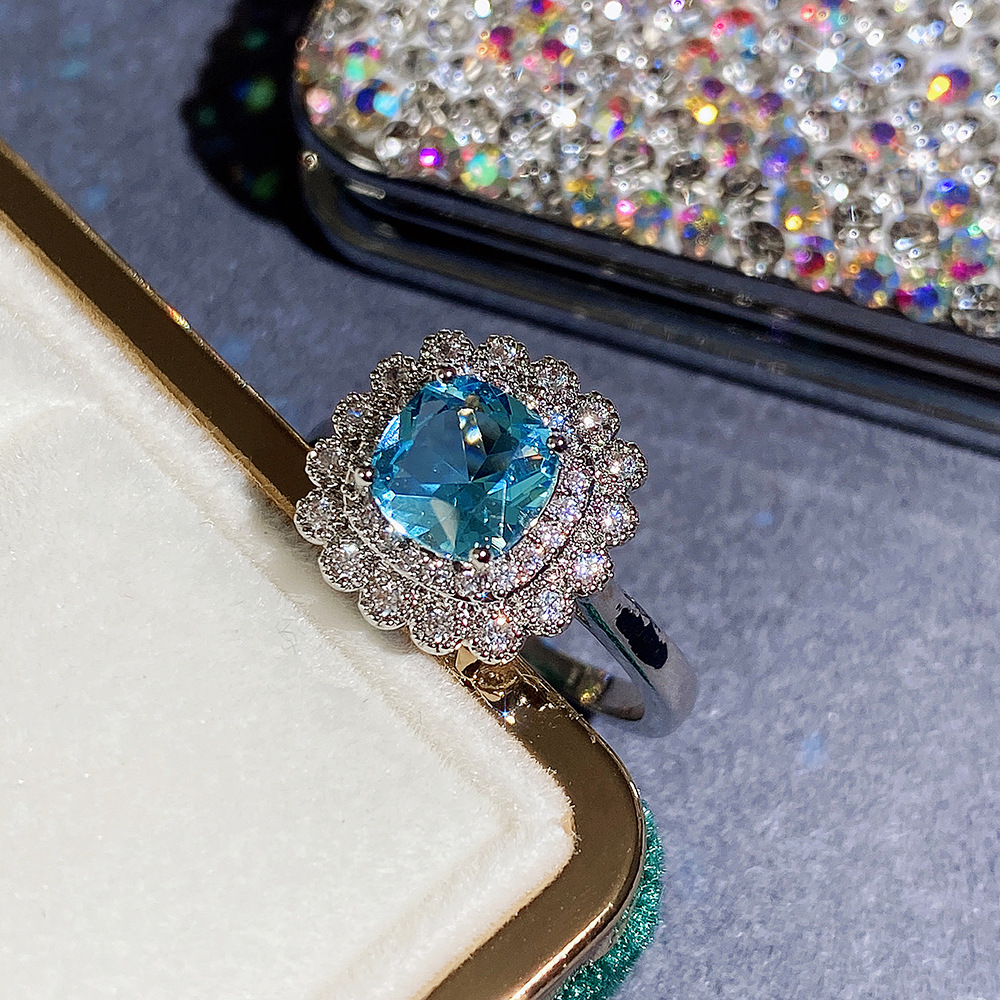 Internet celebrity live jewelry set luxury colored zircon necklace sea blue earrings and ring set