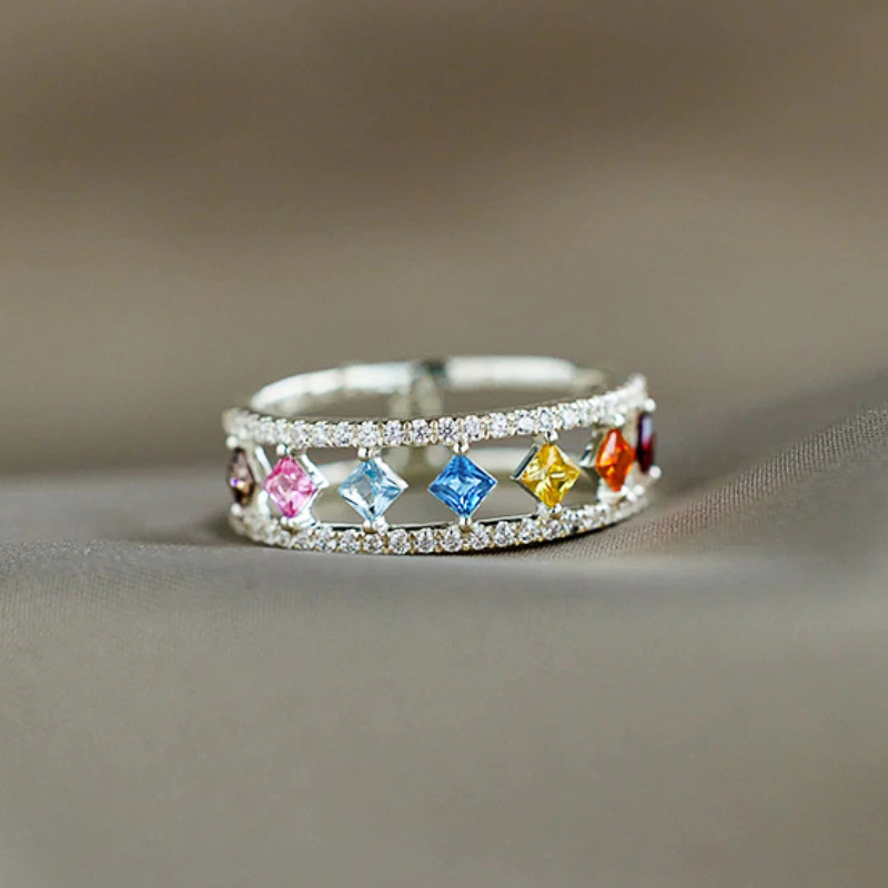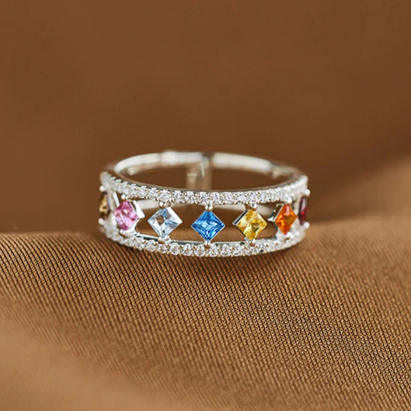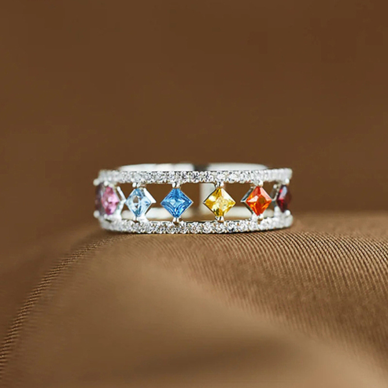 Japanese and Korean exquisite colored rings for women, diamond-shaped geometric double-layer rings, fashionable and personalized, internet celebrity style, dopamine