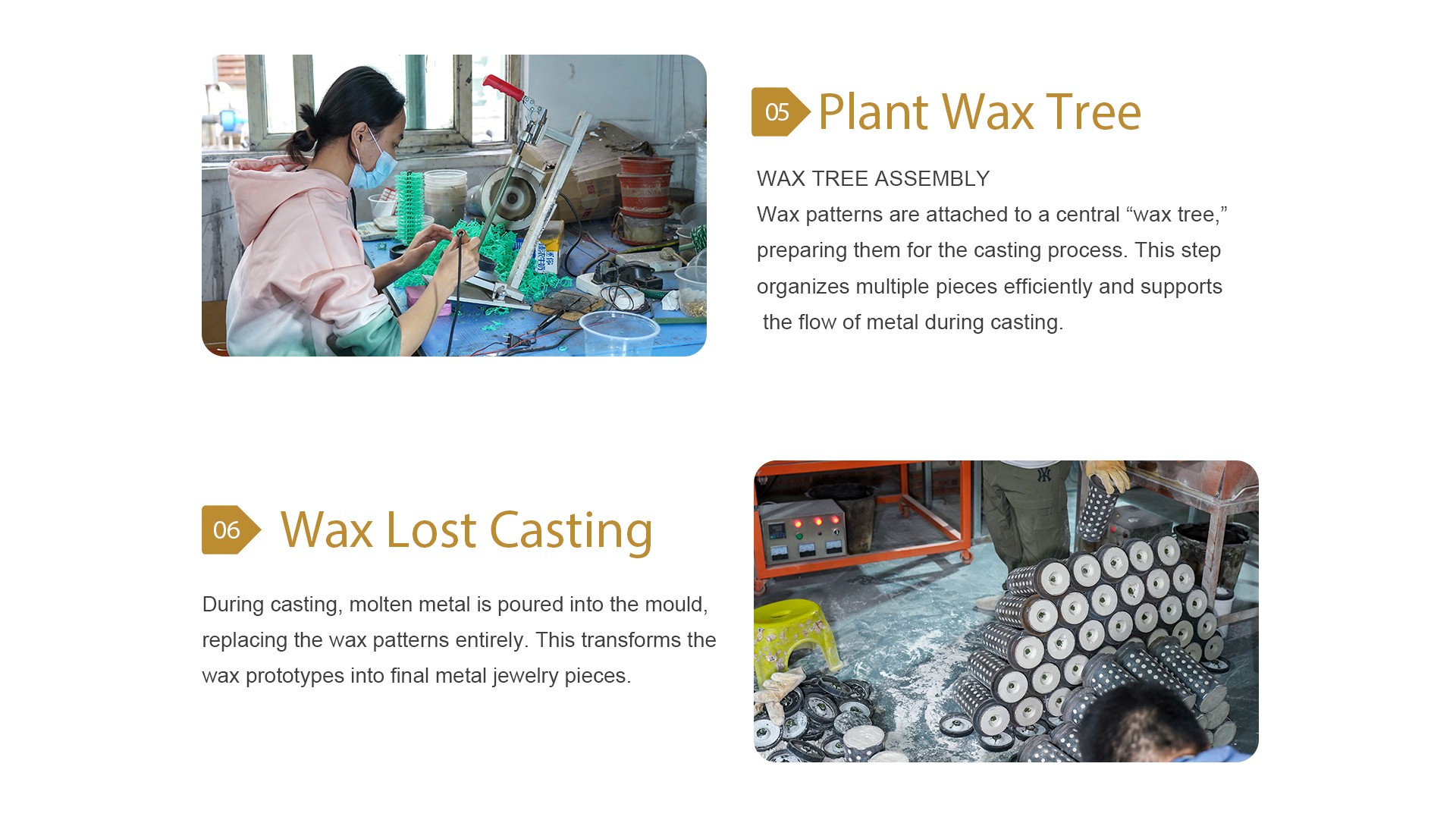 Wax patterns are attached to a central “wax tree,” preparing them for the casting process. This step organizes multiple pieces efficiently and supports the flow of metal during casting.