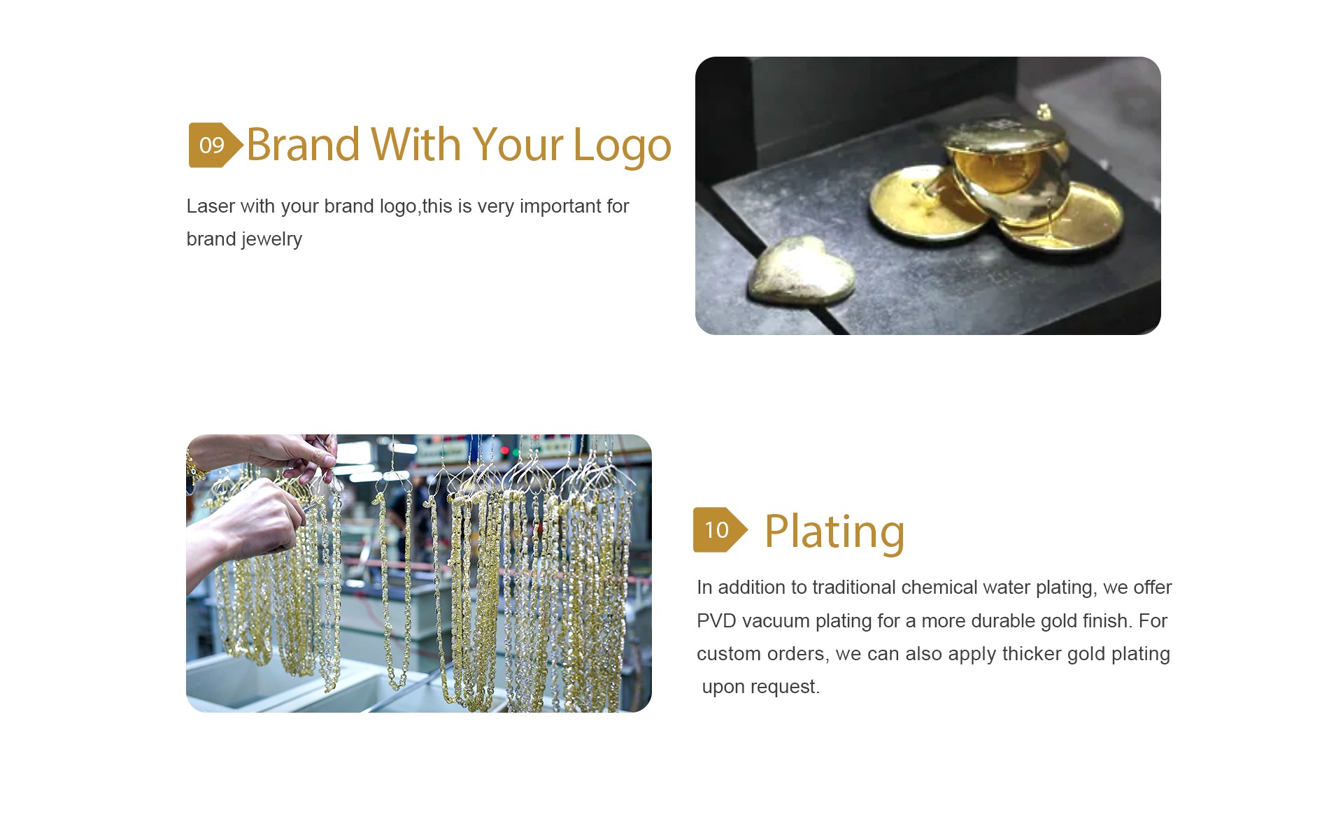 In addition to traditional chemical water plating, we offer PVD vacuum plating for a more durable gold finish. For custom orders, we can also apply thicker gold plating upon request.
