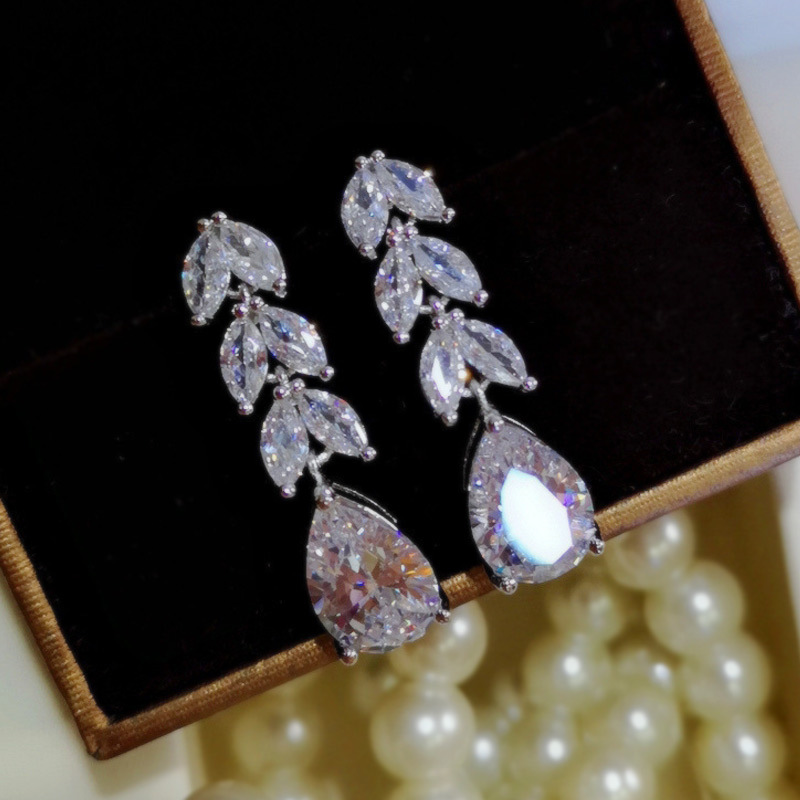 Jewelry wholesale European and American fashion women's medium and long zircon earrings leaf teardrop shaped zircon earrings