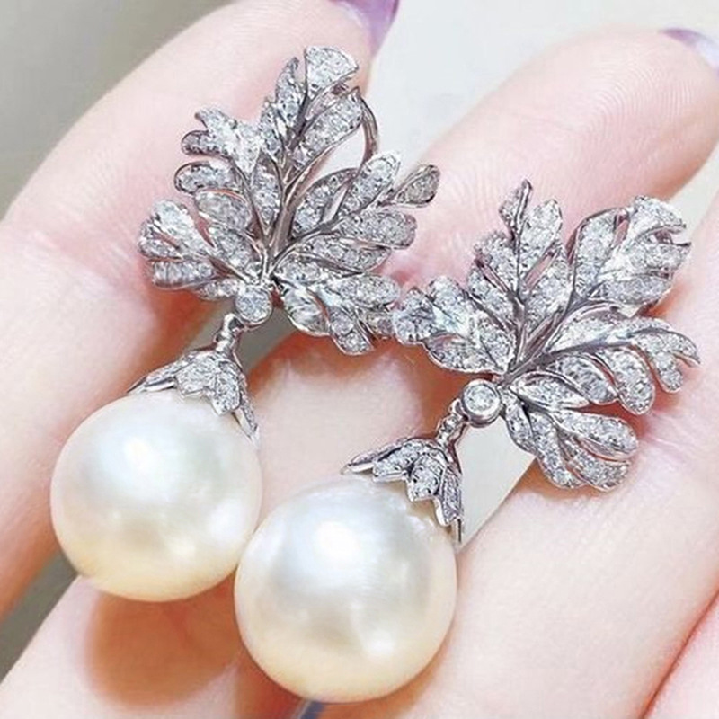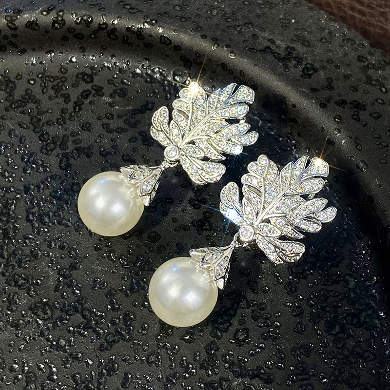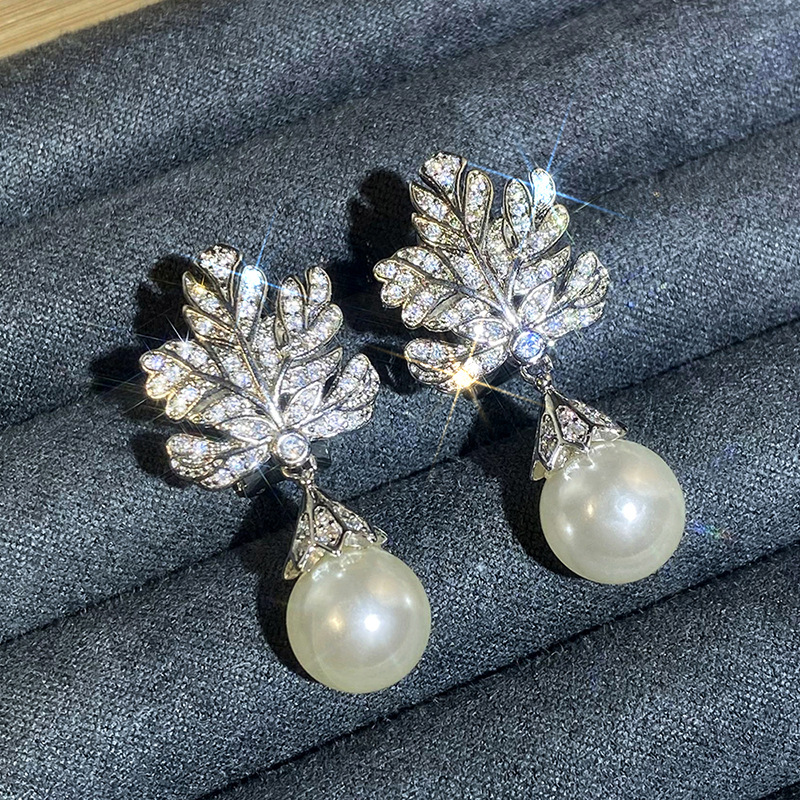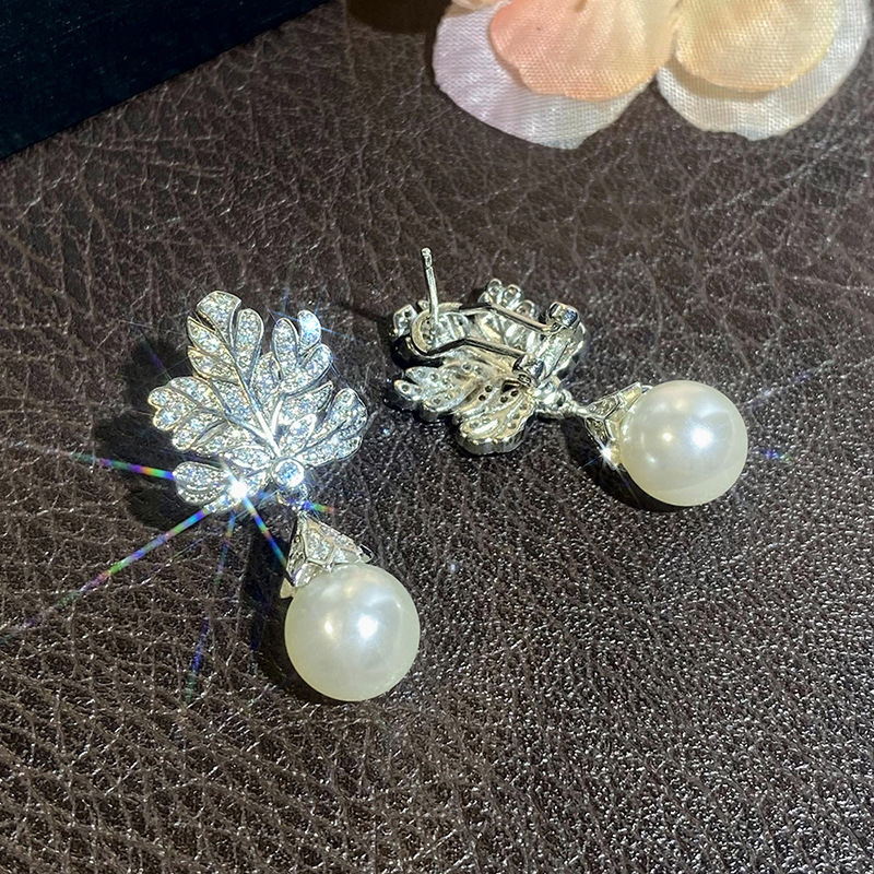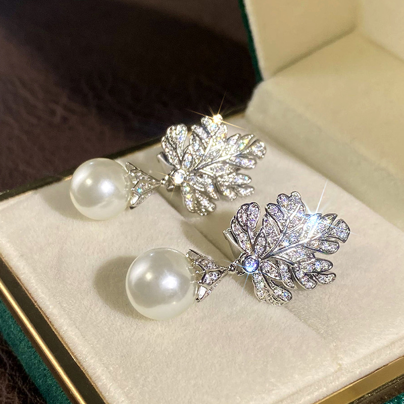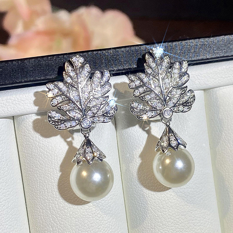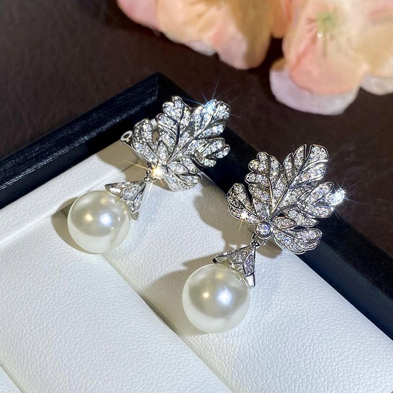 Micro-inlaid shiny high-end leaf earrings for women imitation pearl light luxury design jewelry hot selling