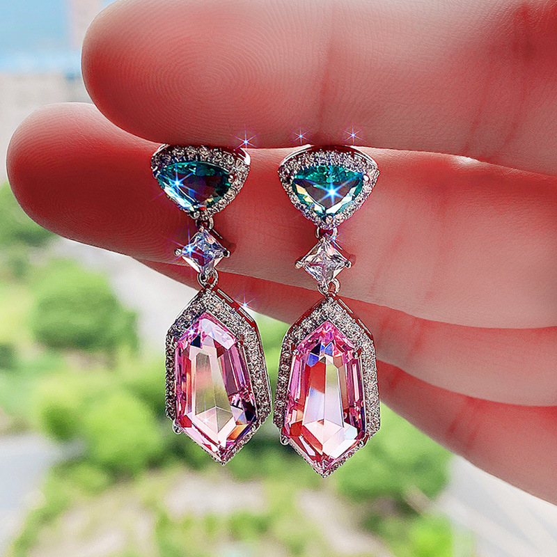 New 3A zircon pink element imitation crystal earrings simple temperament long women's earrings