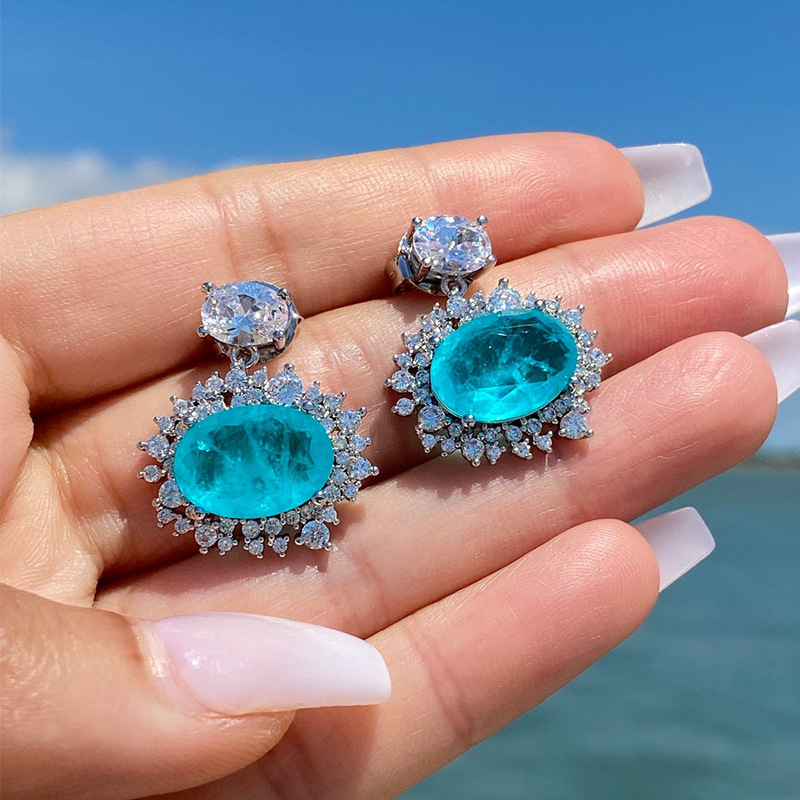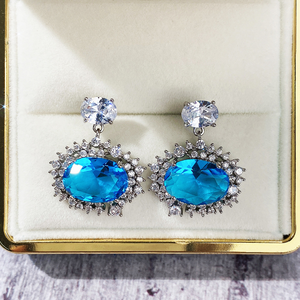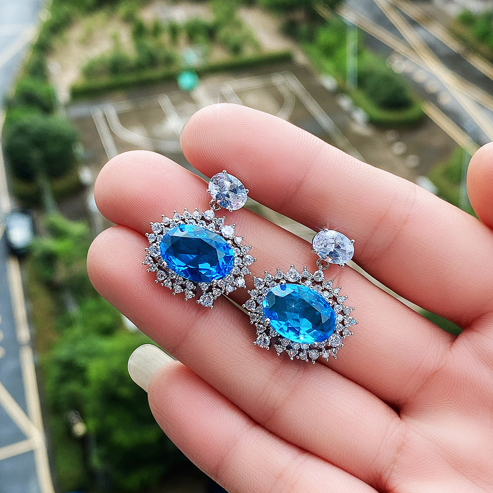 New earrings high-end luxury inlaid sea blue zircon earrings European and American engagement party earrings