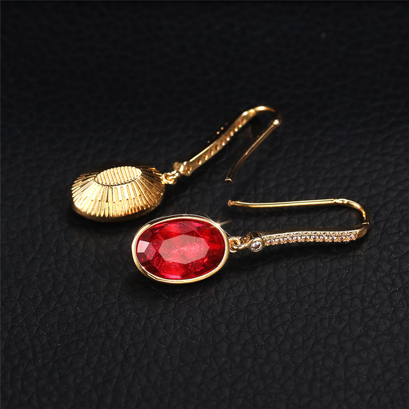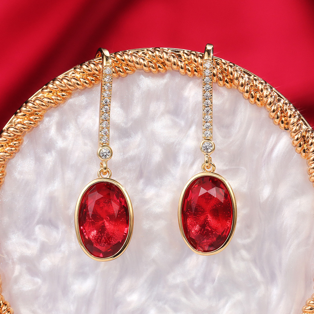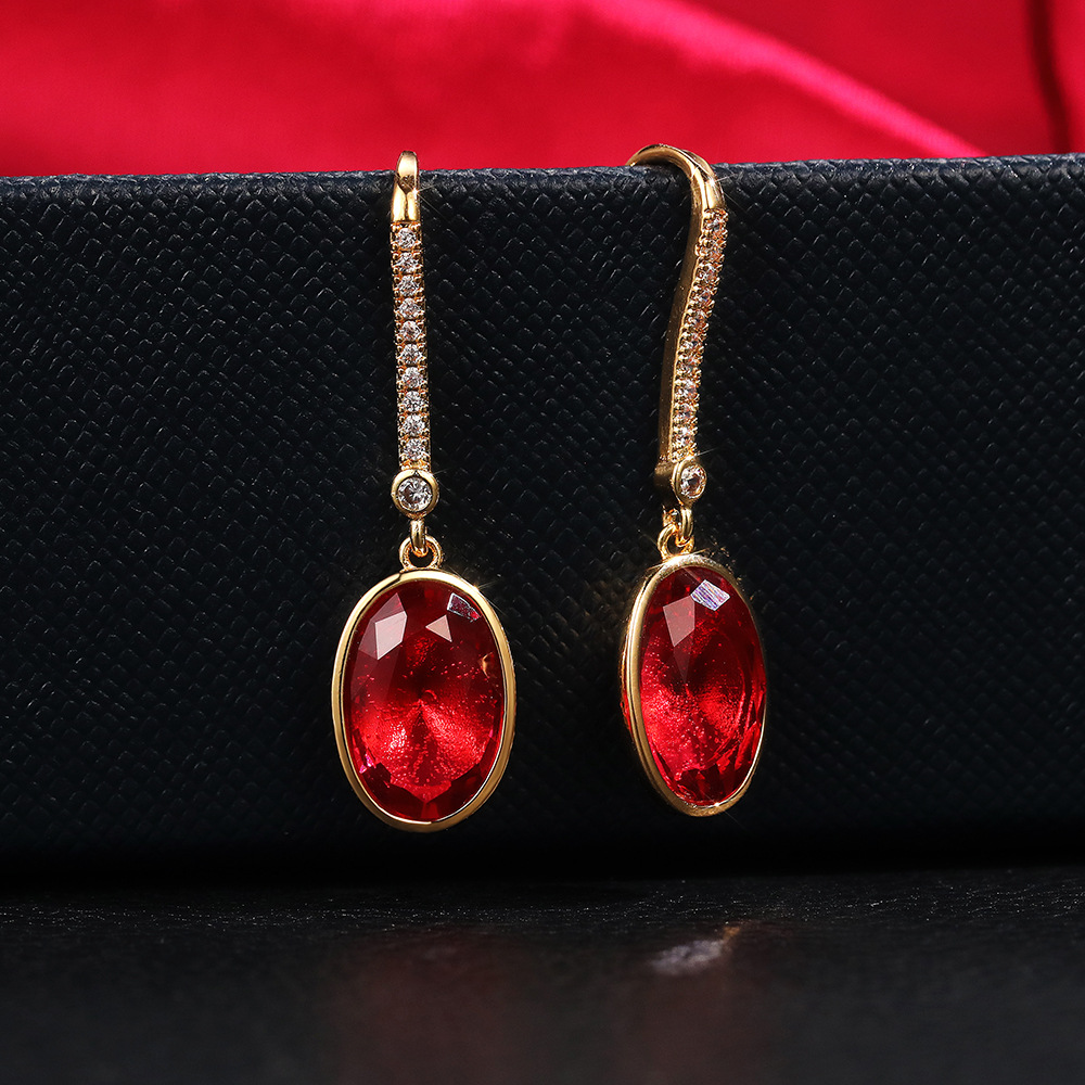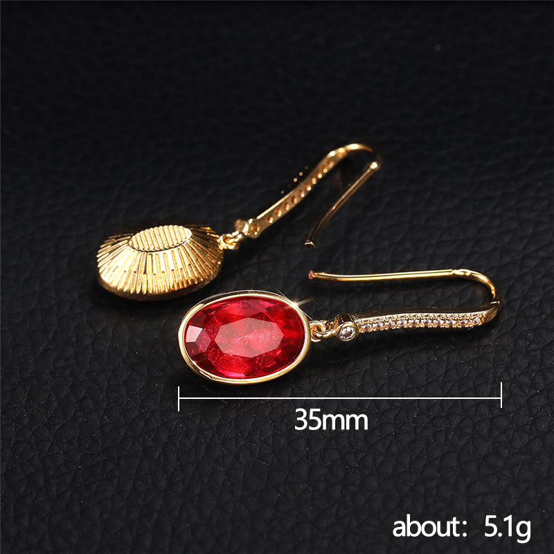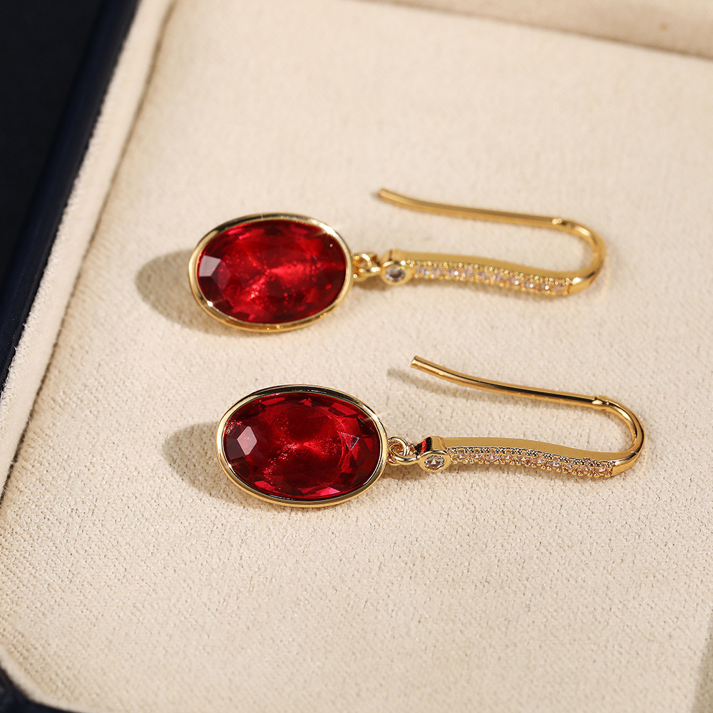 New European and American earrings, Japanese and Korean simple oval red zircon earrings, imitation red corundum gemstone versatile earrings