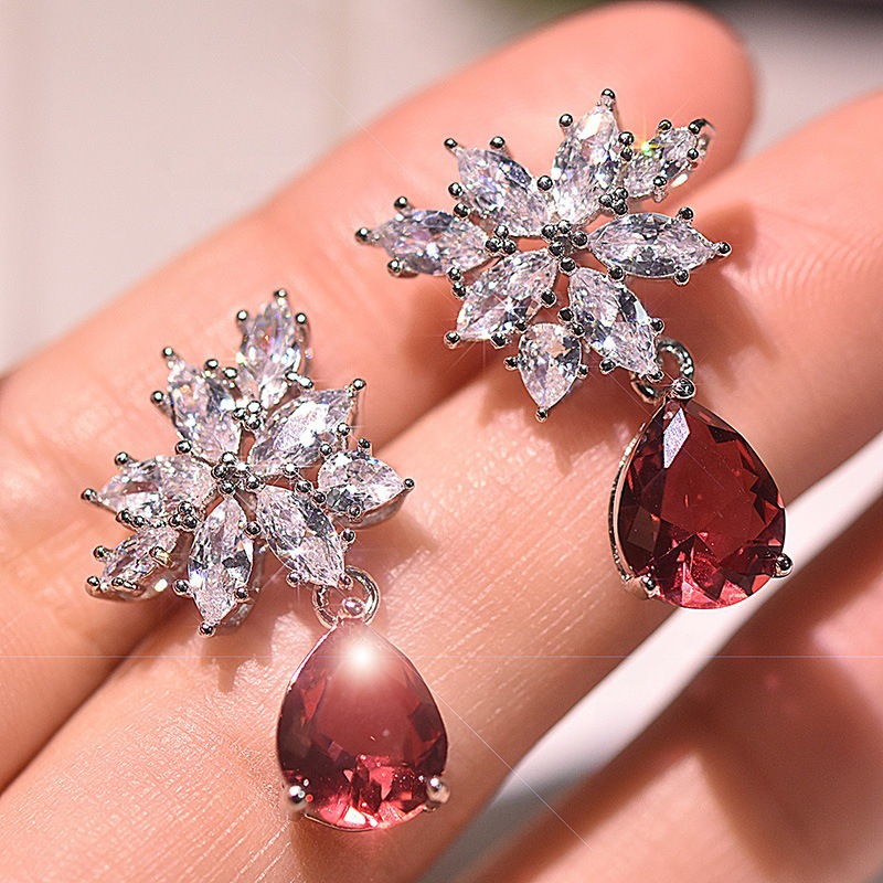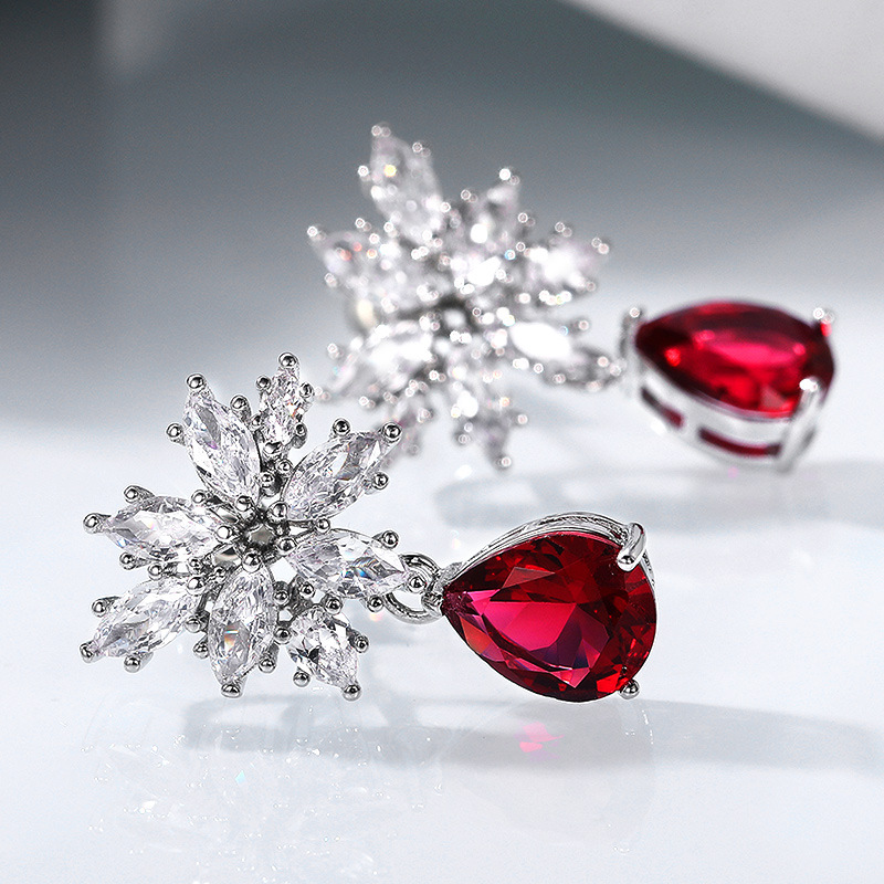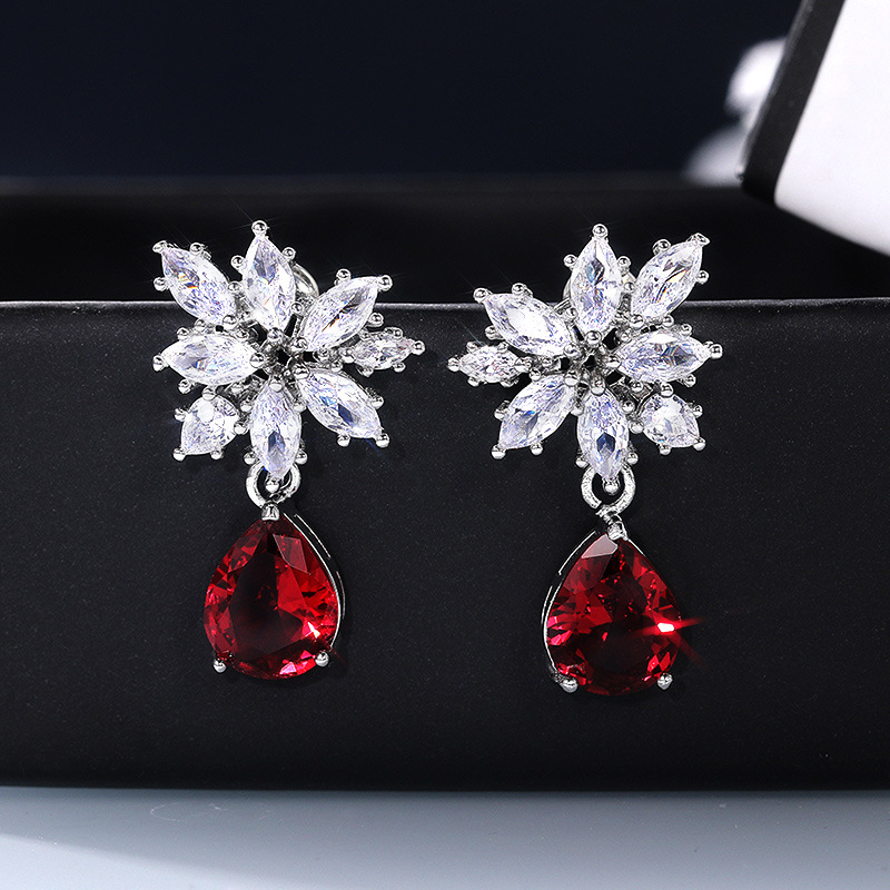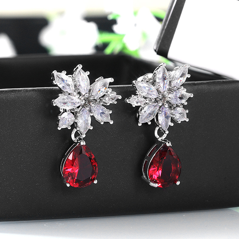 New European and American inlaid teardrop pear-shaped red zircon earrings with full diamond zircon ear studs and earrings