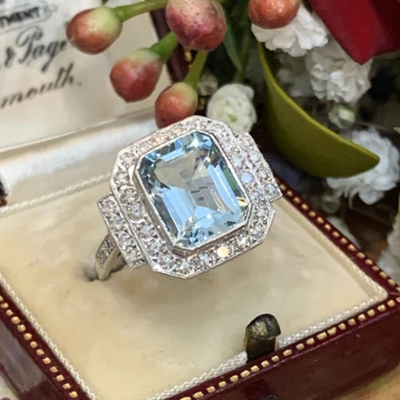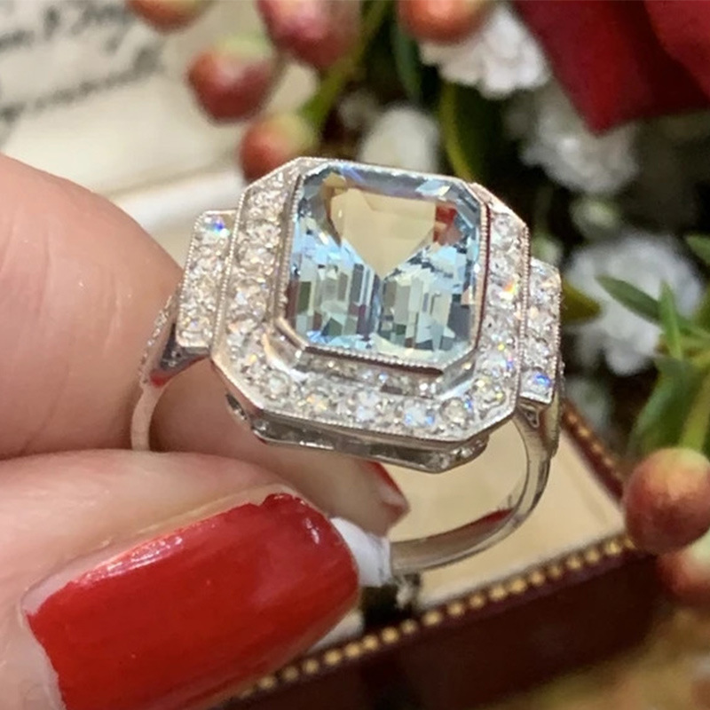 New European and American style luxury square sea blue zircon ring high-end anniversary celebration wear ring