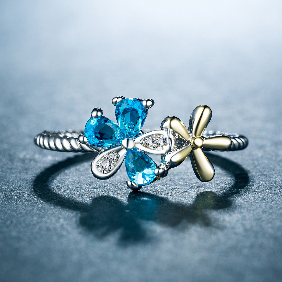 New fashion two-color flower ring for women, threaded copper-plated white gold zircon color ring