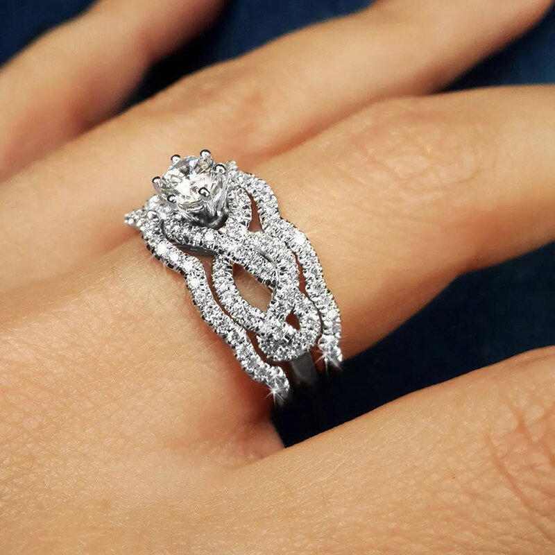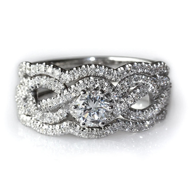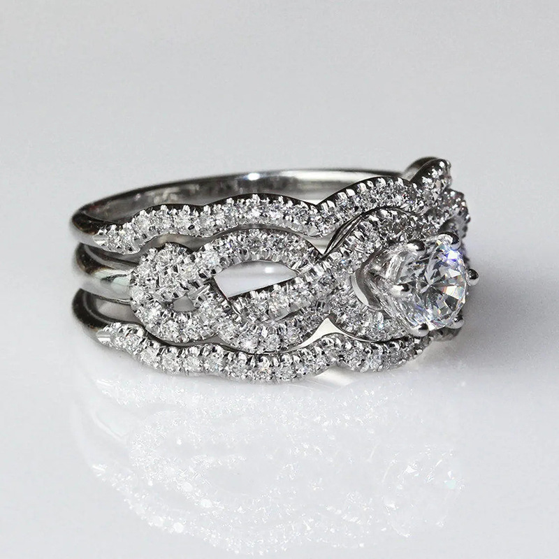 New heavy-duty luxury ring European and American micro-inlaid zircon three-set ring temperament geometric wave female ring