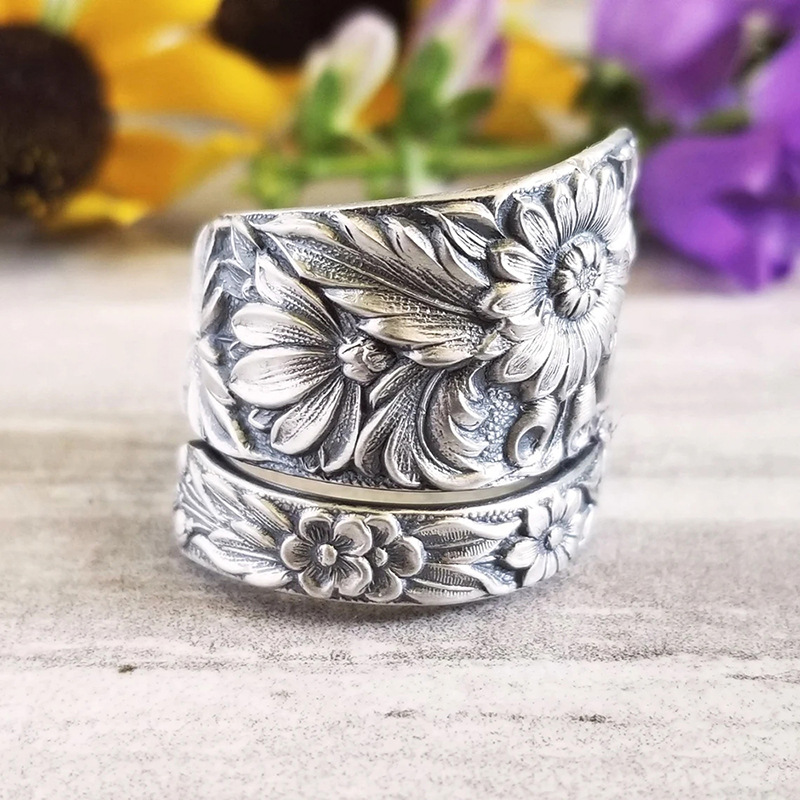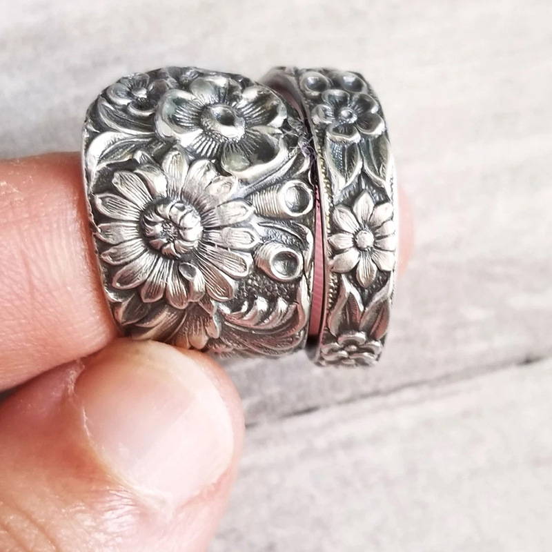 Classic retro engraved auspicious flower ring classical wide version Miao ring Yunnan ethnic style men and women's jewelry