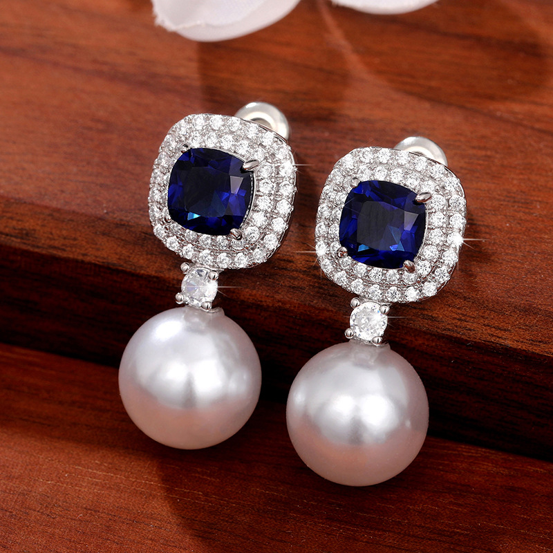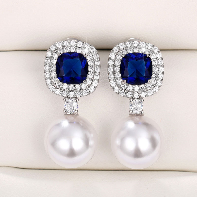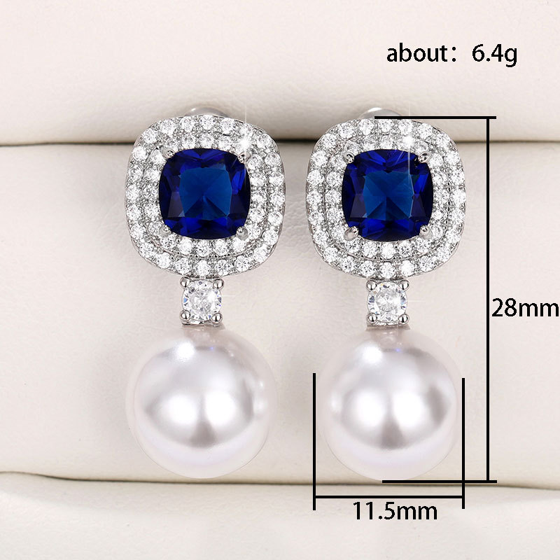 Popular and hot-selling imitation pearl earrings in Europe and America, high-end inlaid sapphire blue zircon earrings factory direct sales
