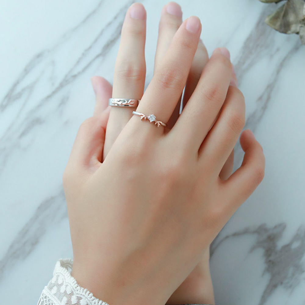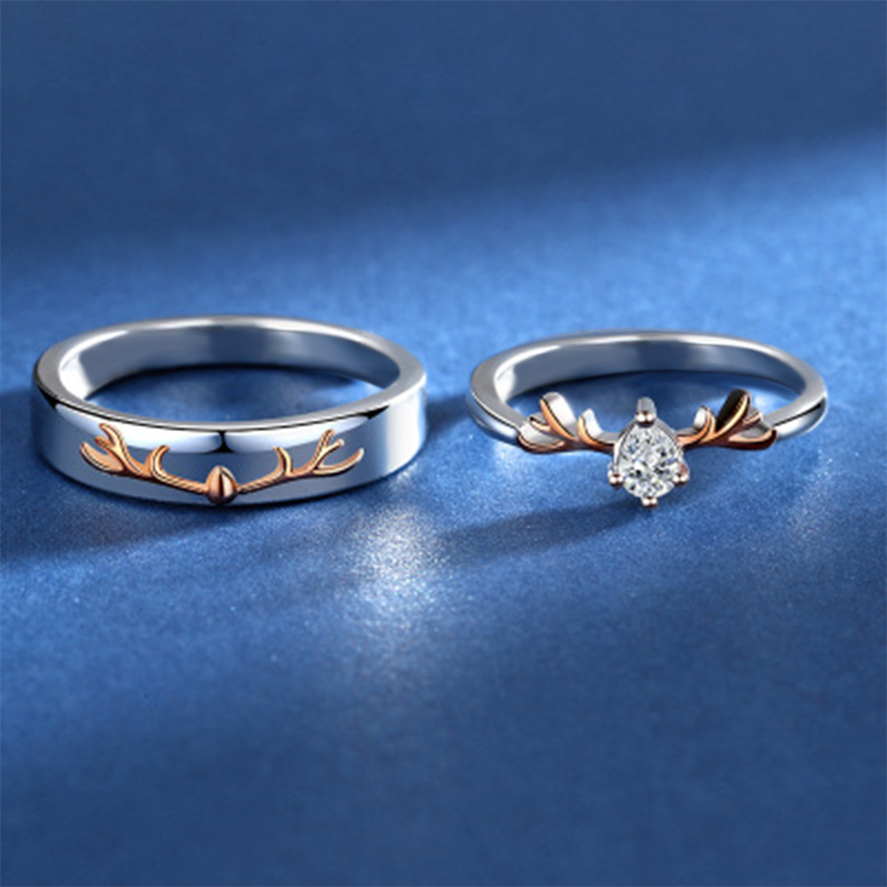 Popular online fashion simple elk antler shape couple ring two-tone copper inlaid zircon combination ring