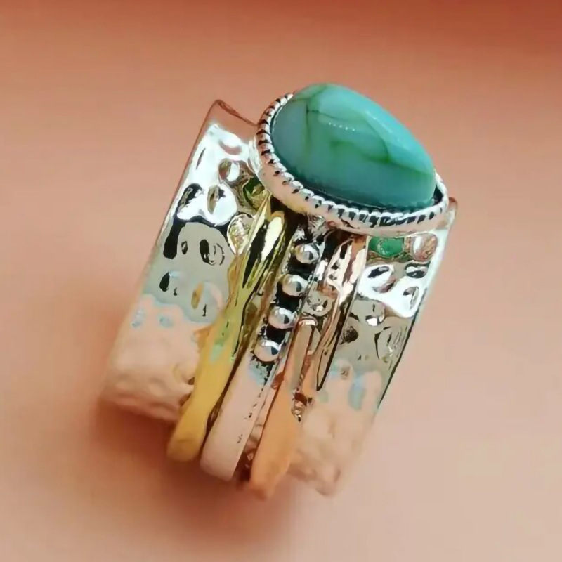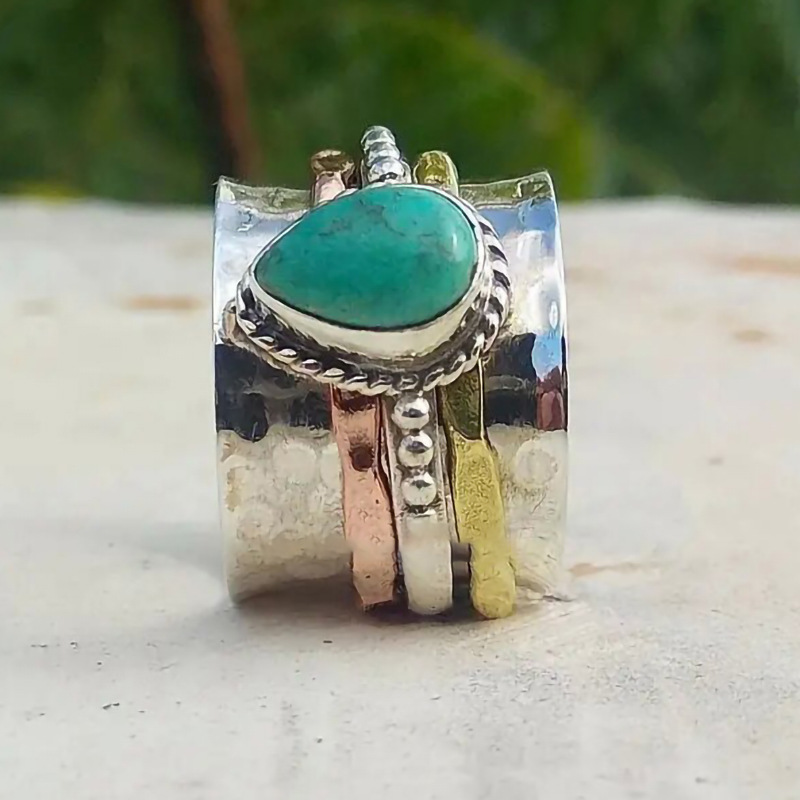 Popular retro imitation turquoise ring water drop three-color ring domineering Bohemian style ring