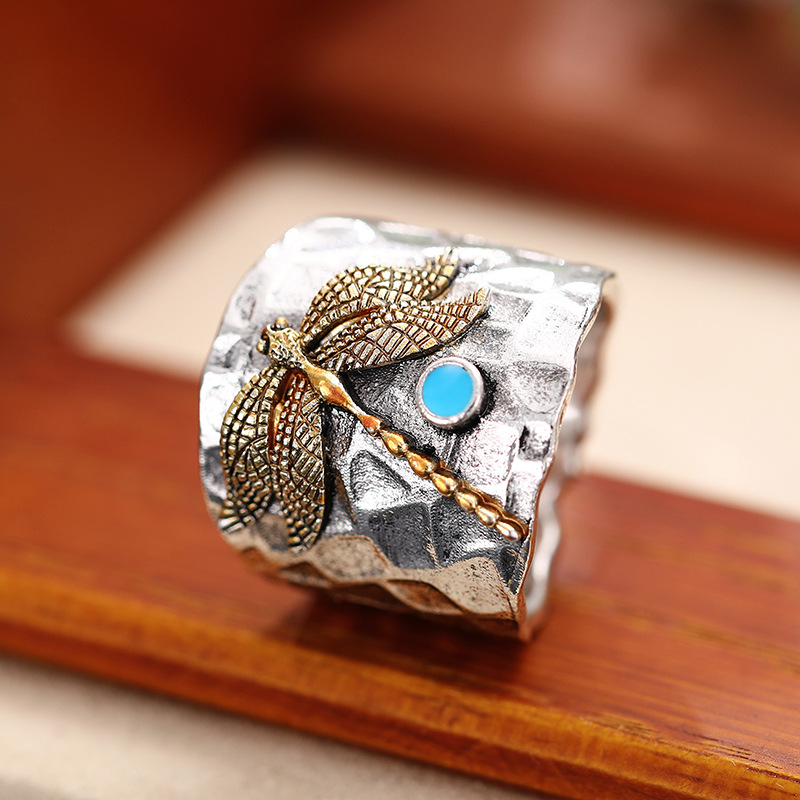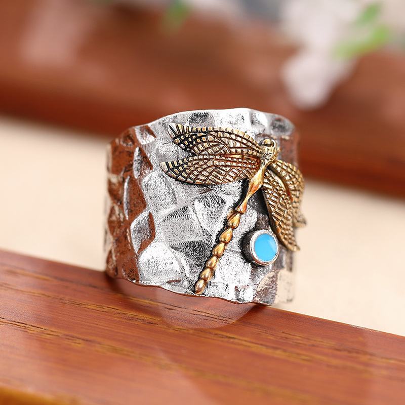 Popular retro style carved ring European and American exaggerated round tube dragonfly ring unisex ring