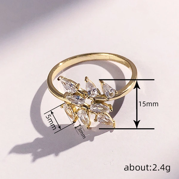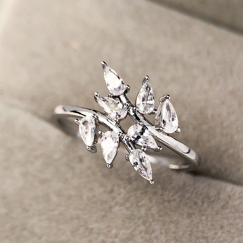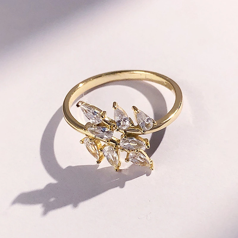 Anel de design geométrico por atacado de fábrica de fonte, joia feminina de nicho, design de personalidade, anel de gota de água com folha