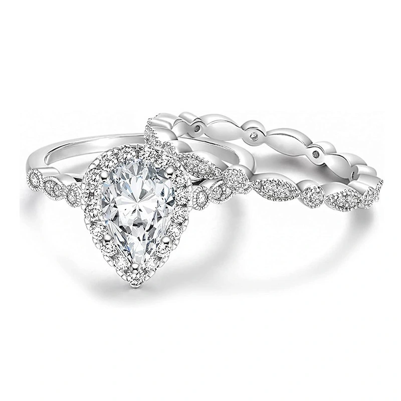 Anel de olho de cavalo retro europeu e americano, gota de água, formato de pêra, casamento, dois conjuntos de anéis, design clássico e simples, sentido de anel feminino