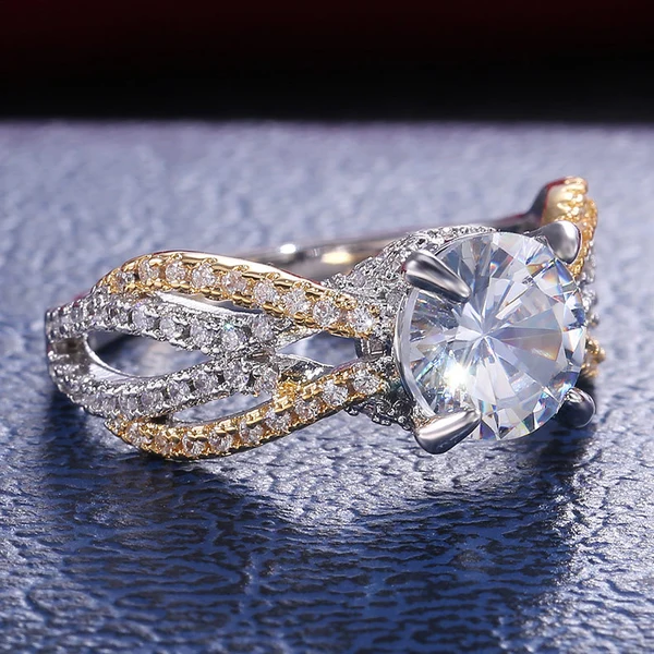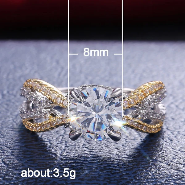 Anel clássico de quatro garras com microincrustações de zircónias sintéticas, anel de braço torcido de duas cores com fileira dupla para mulher, anel de noivado e casamento