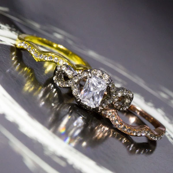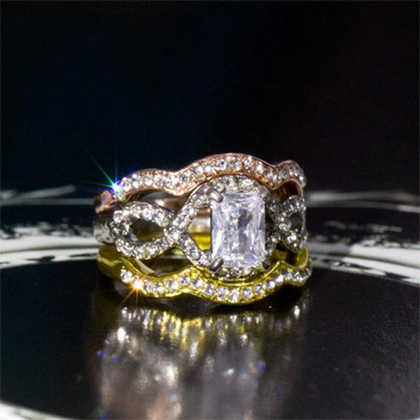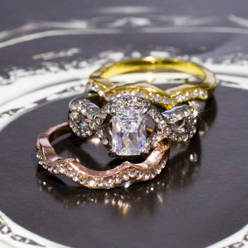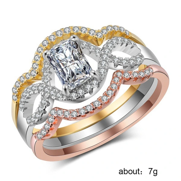 Anel europeu e americano de venda quente, requintado, com zircónia oca, diamante, três cores, moda feminina, popular, três conjuntos de anéis