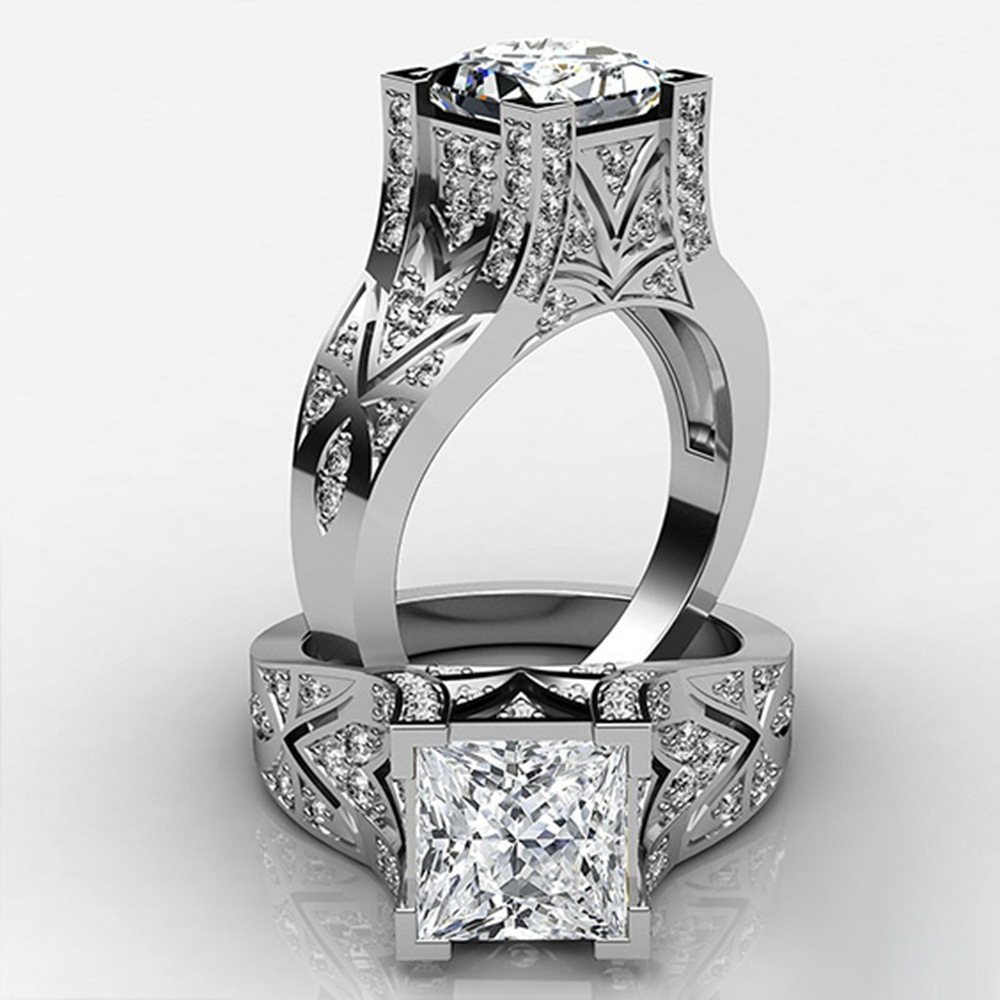 Anel de diamante de zircónia exagerado branco e prata europeu e americano mais vendido
