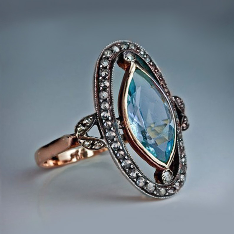 Anel de cristal azul oco esculpido em estilo retro europeu e americano de venda quente de comércio eletrónico, joias luxuosas estilo palácio