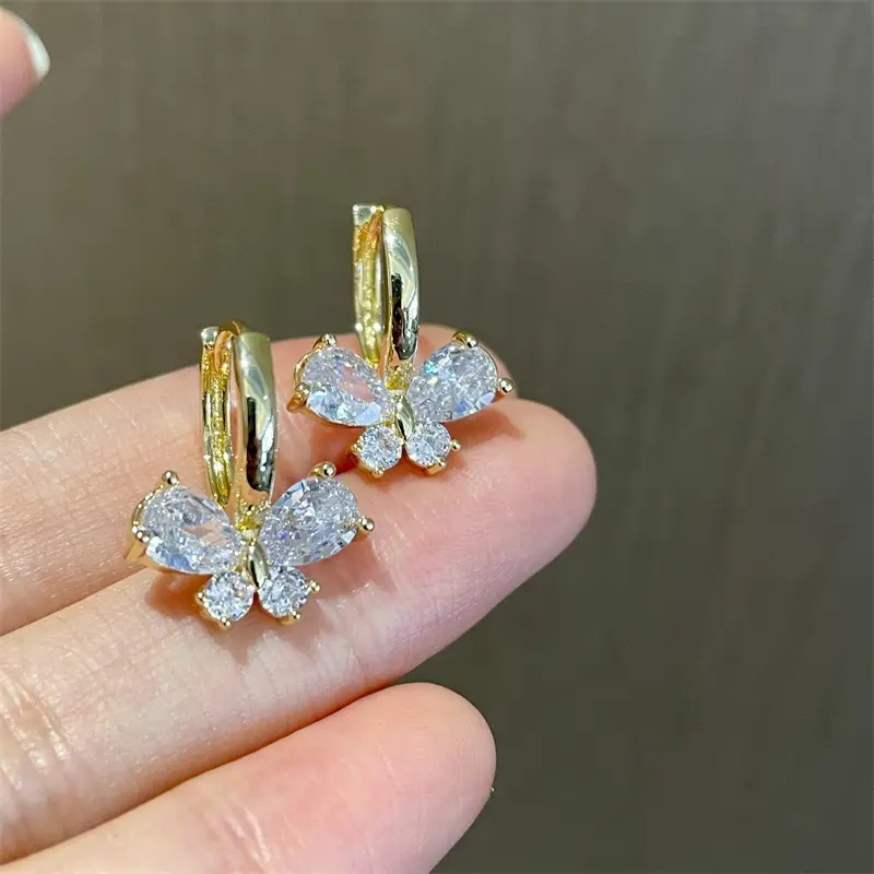 brincos de borboleta requintados e elegantes para mulheres incrustados com zircónia, clipes de orelha brilhantes e doces, brincos diários femininos