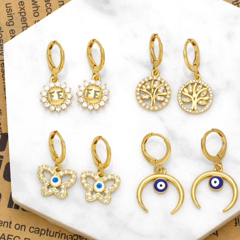 Brincos europeus e americanos com letra fe de diamante para mulheres, brincos de olho de diabo com personalidade da moda, árvore da vida, atacado ert53