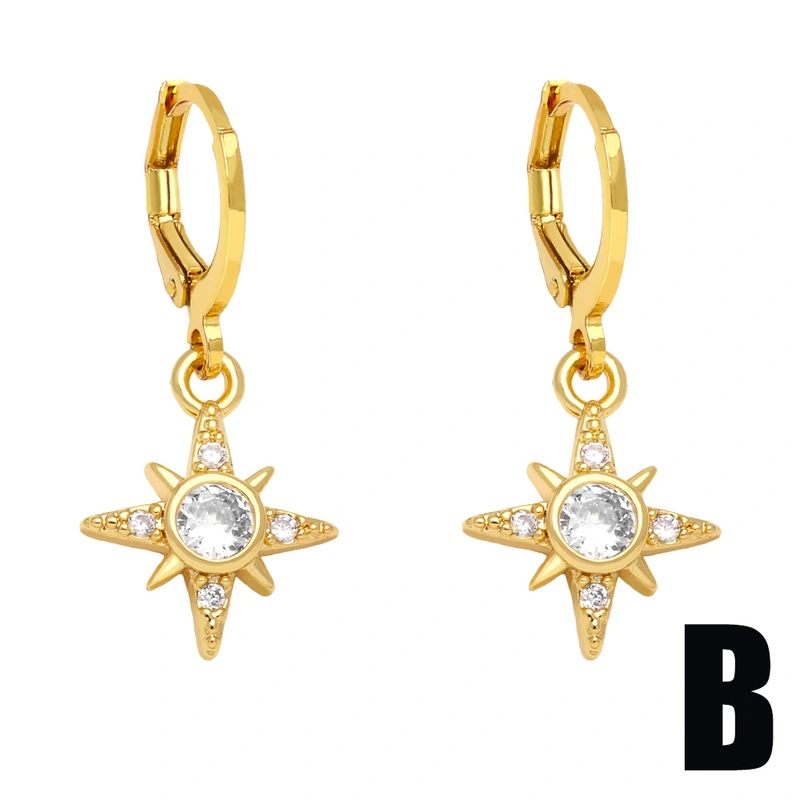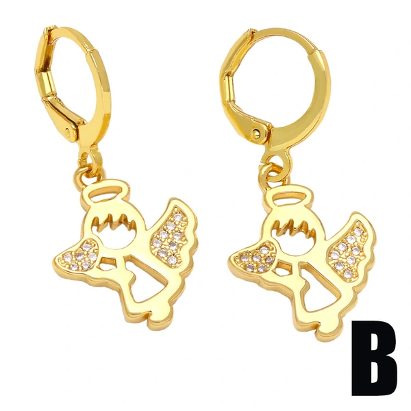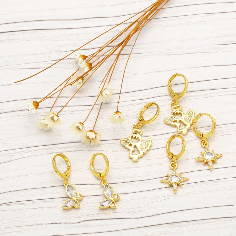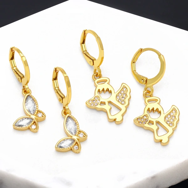 Brincos femininos com zircônia incrustada, europeus e americanos, em liquidação, brincos retrô de ouro, brincos de borboleta e anjo, era129