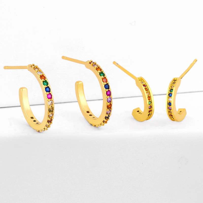 Brincos redondos de zircônia colorida criativa em liquidação, brincos geométricos em formato de C, brincos de zircônia colorida microincrustada em cobre galvanizado ers92